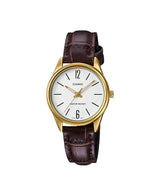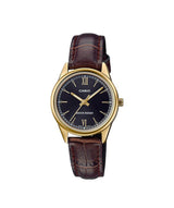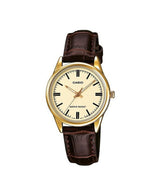 El Casio LTP-V005GL-9AUDF ofrece un diseño clásico y elegante con caja dorada y correa de cuero marrón. Su dial dorado aporta un estilo sofisticado ideal para uso diario o formal, manteniendo la estética tradicional de la línea Dress de Casio.