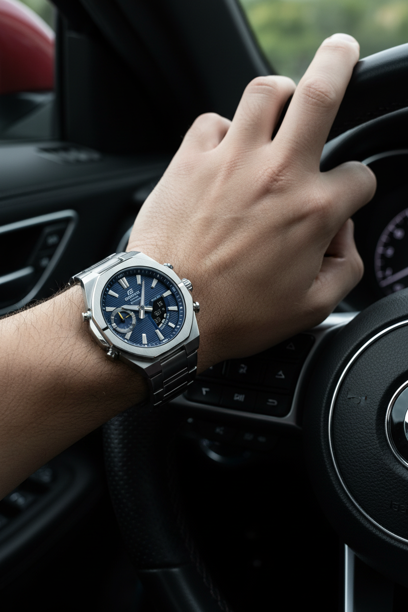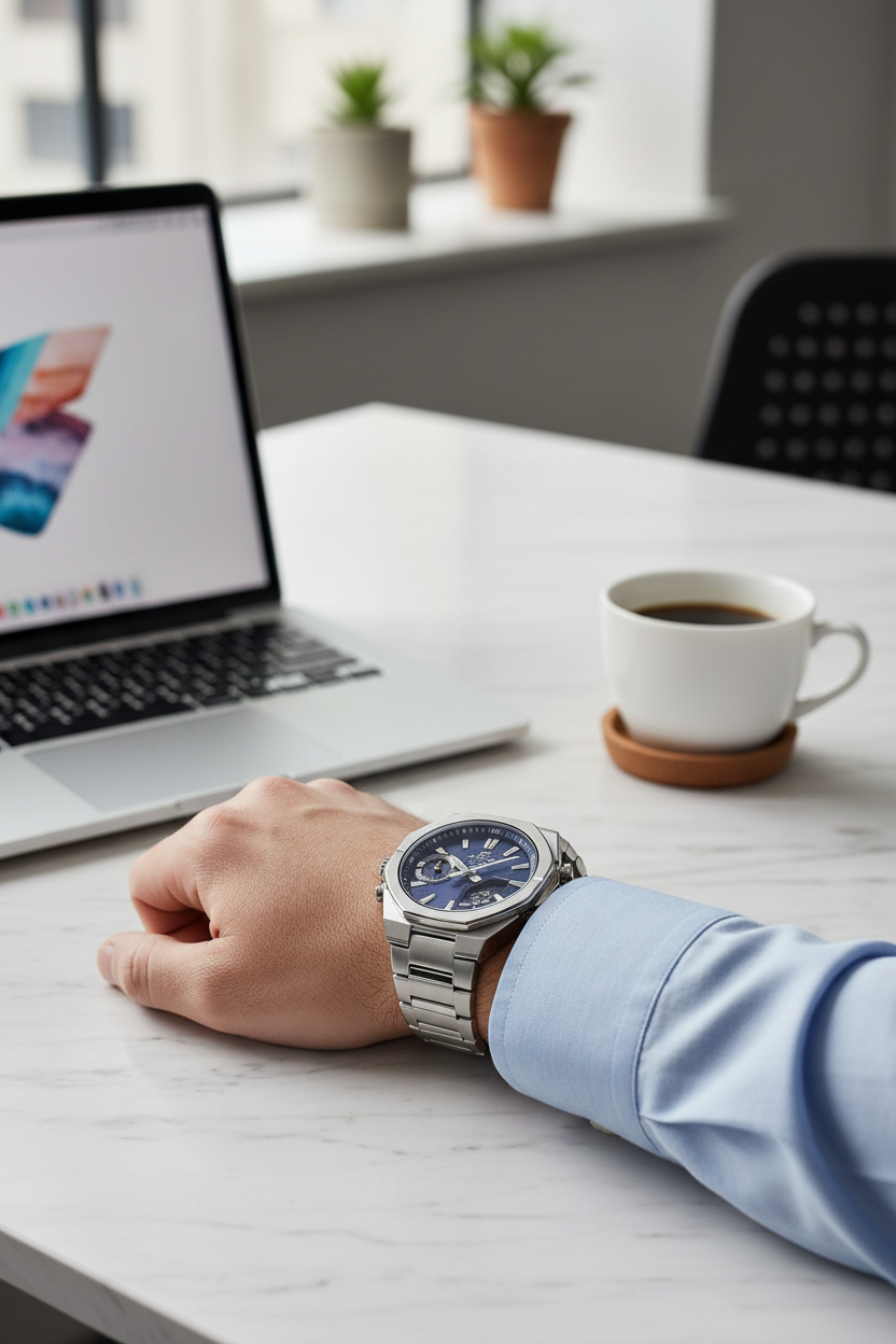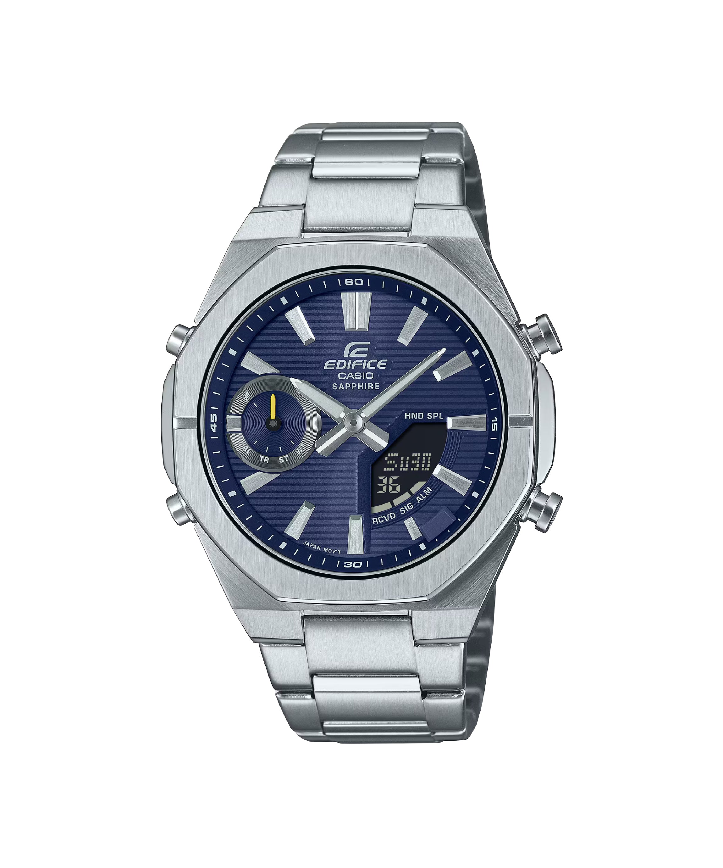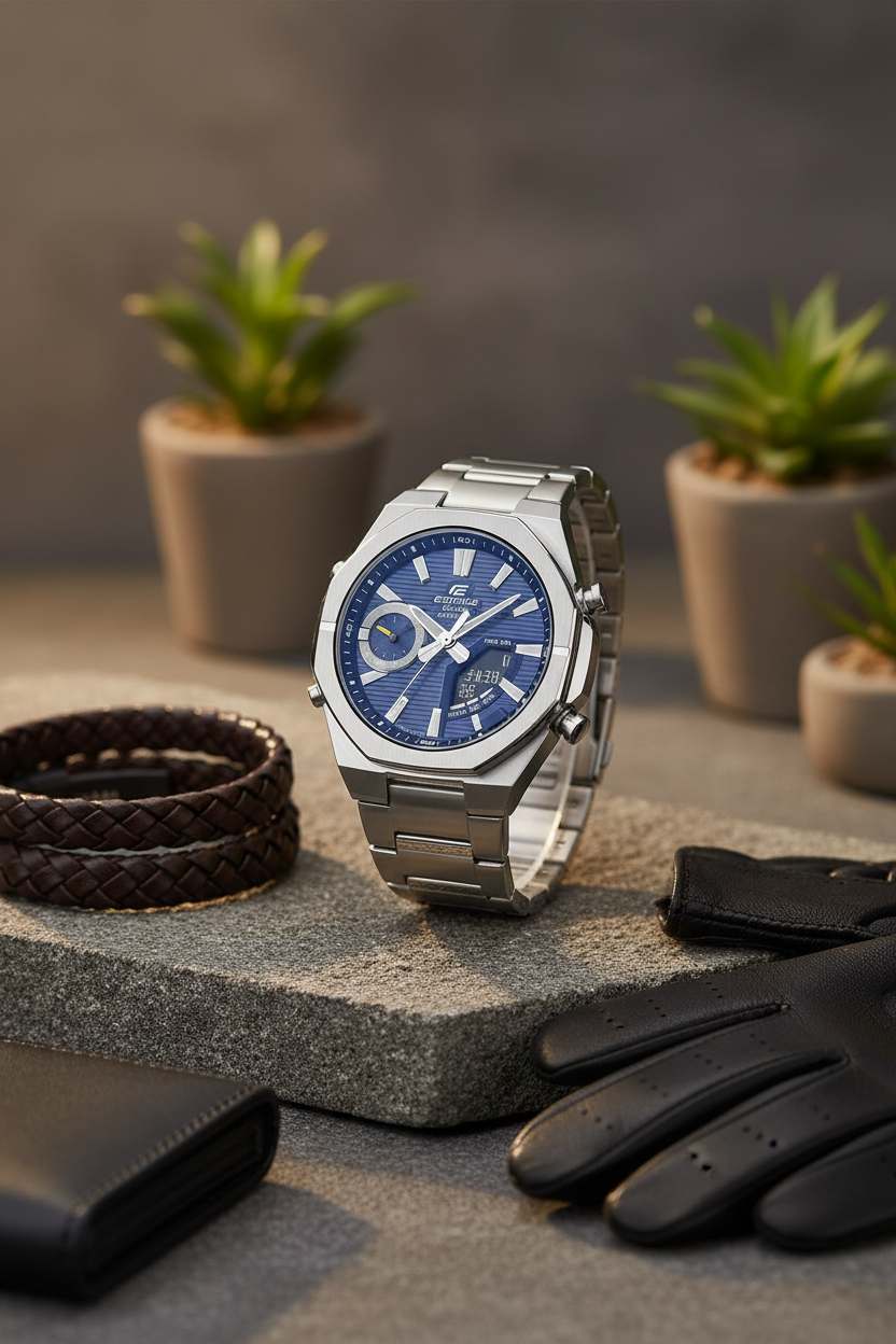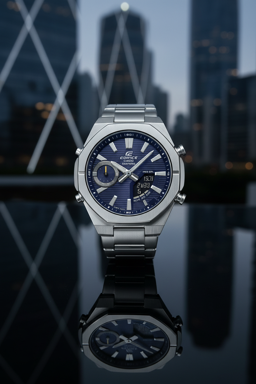 | Funciones especiales | Esfera azul con display analógico-digital, caja y brazalete de acero inoxidable plateado con bisel octogonal deportivo, cristal de zafiro resistente a rayones, doble luz LED (Super Illuminator), función de búsqueda de teléfono, movimiento de agujas para despejar la pantalla, tamaño aproximado 48,1 × 43 × 9,6 mm y peso de 129 g; diseño moderno y delgado ideal para combinar con ropa casual y de oficina. |