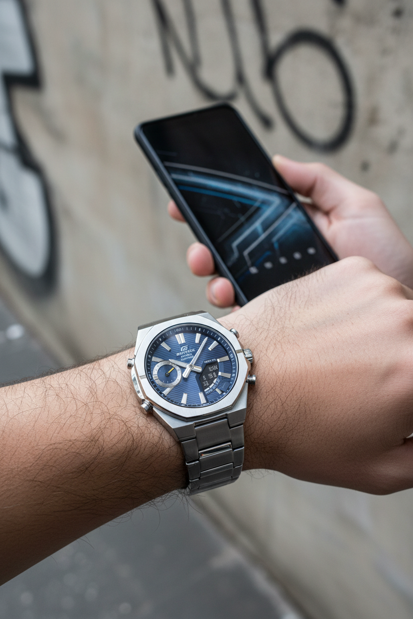 | Funciones principales | Hora analógica y digital combinada con cronógrafo de 1/100 segundos, hora mundial (38 ciudades), temporizador regresivo, 5 alarmas diarias, calendario automático y ajuste de hora automático vía Bluetooth con la app CASIO WATCHES; pensado para uso diario deportivo y de oficina con alta funcionalidad. |