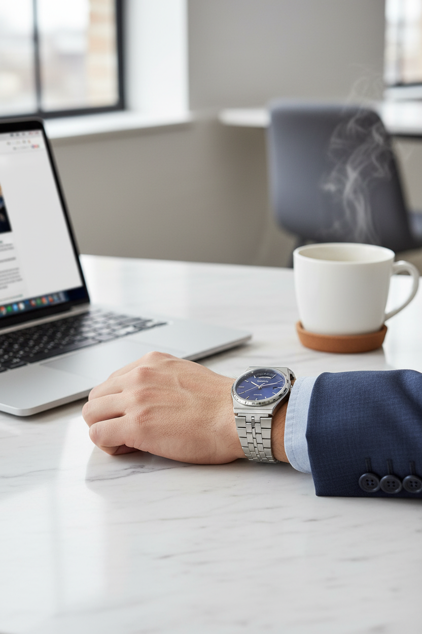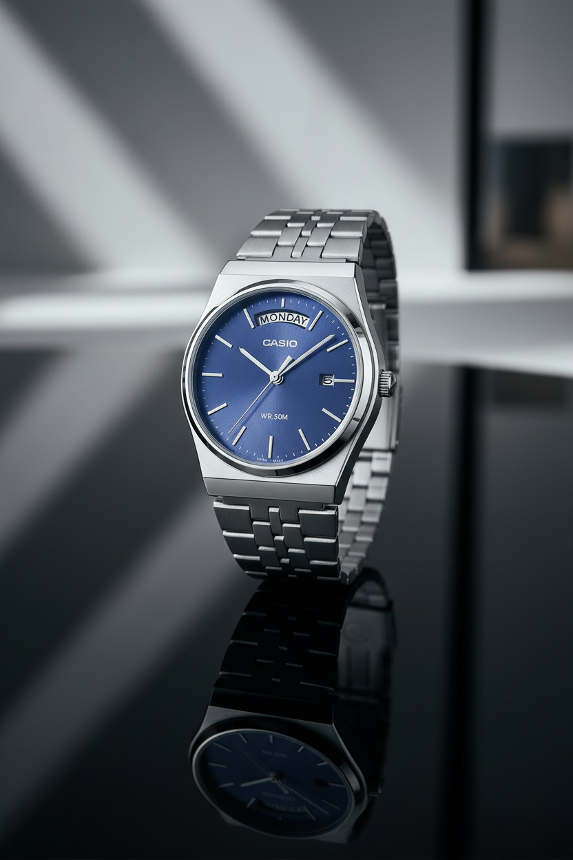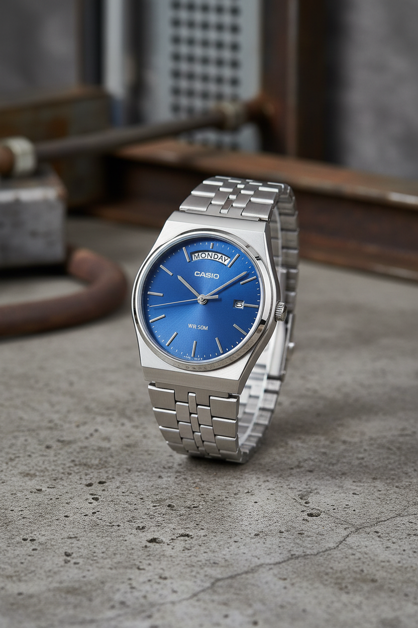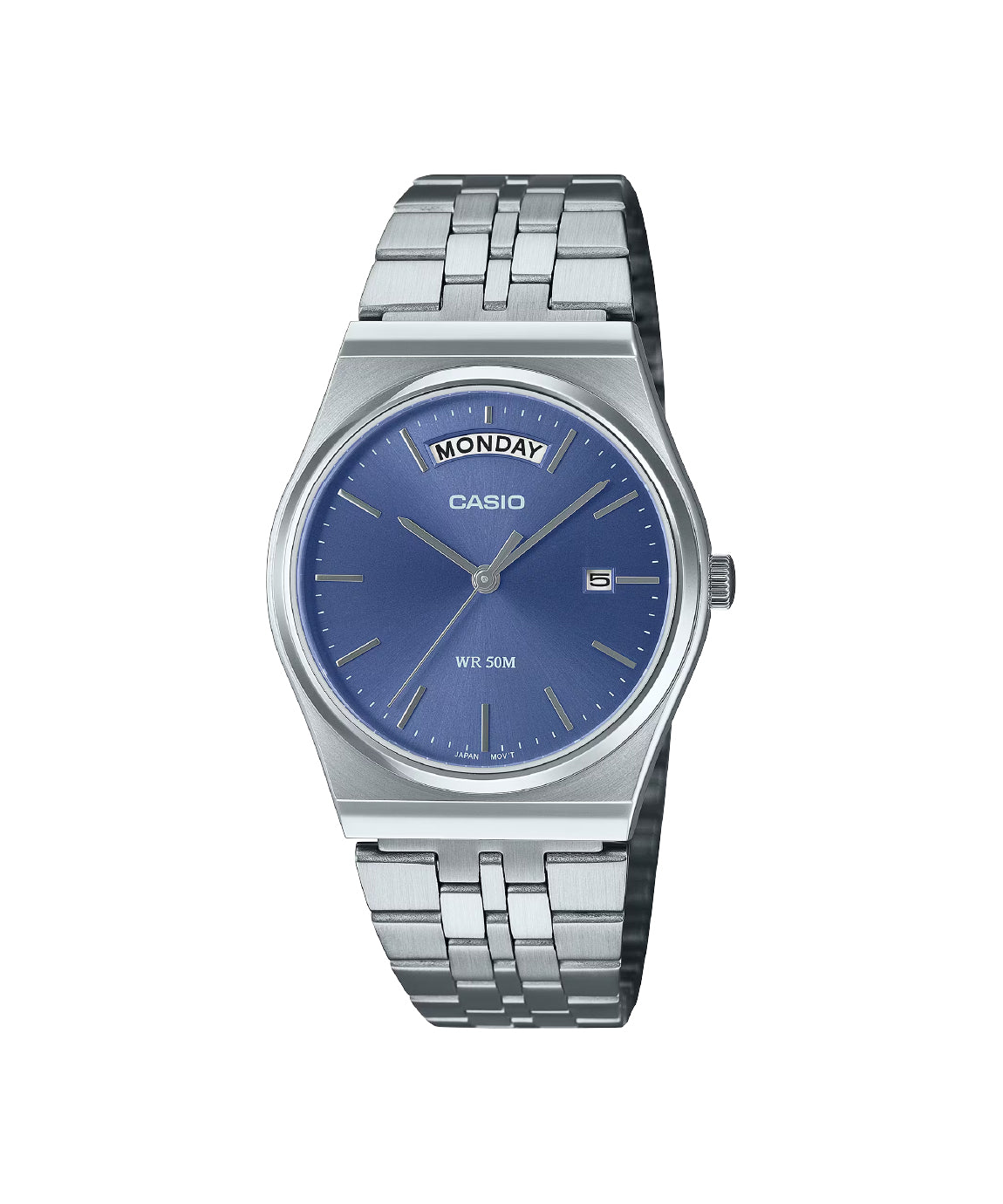 | Funciones especiales | Esfera azul con paleta de colores retro y diseño de dial minimalista limpio, indicador de día ubicado sobre las 12 como detalle característico de la serie; caja redonda de acero inoxidable plateada, correa de acero inoxidable con cierre de triple pliegue de un solo toque con eslabones removibles para ajuste (150 a 205 mm), cristal mineral resistente a rayaduras; dimensiones 40,8 × 35 × 8 mm y peso de 85 g; diseño clásico sobrio de perfil ultra-slim ideal para uso diario y ocasiones formales. |