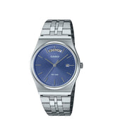 Reloj Casio MTP-B146D-2AVDF análogo clásico retro para hombre, caja redonda de acero inoxidable (40,8 × 35 × 8 mm) con acabado azul sofisticado, correa de acero inoxidable pulido azul con cierre triple de un solo toque (ajustable de 150 a 205 mm), esfera azul con 3 agujas y visualización de día y fecha a las 3 en punto, cristal mineral, resistencia al agua 50 m, batería SR920SW con duración aproximada de 3 años y peso de 85 g.
