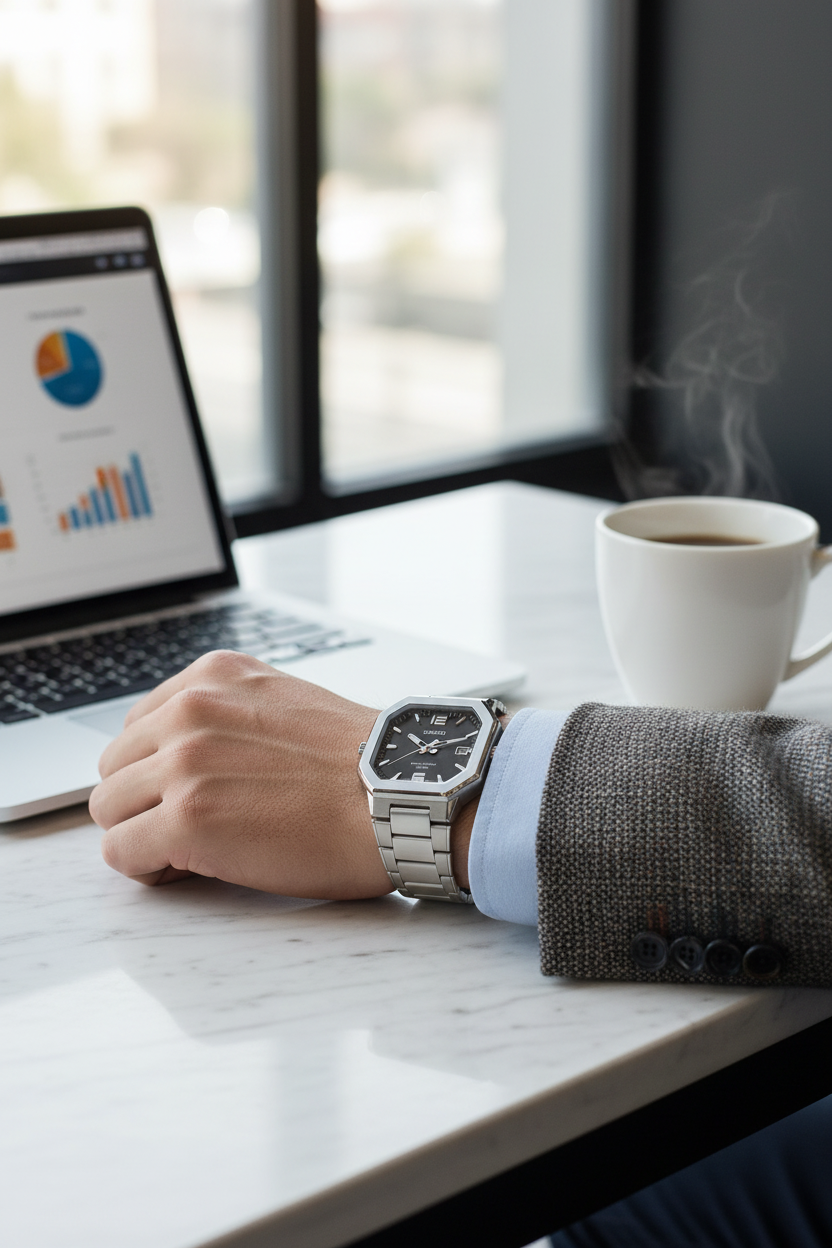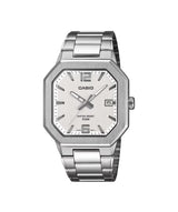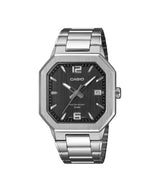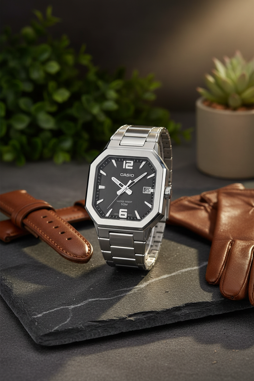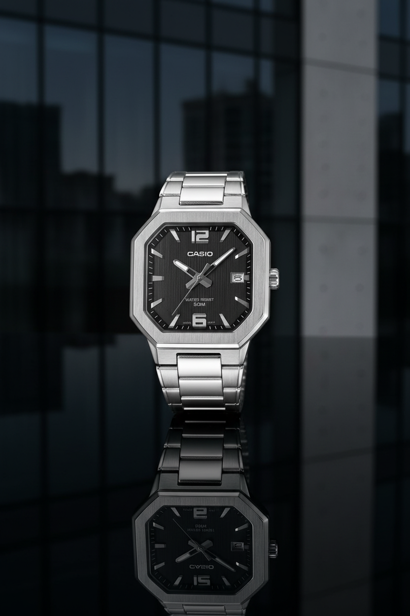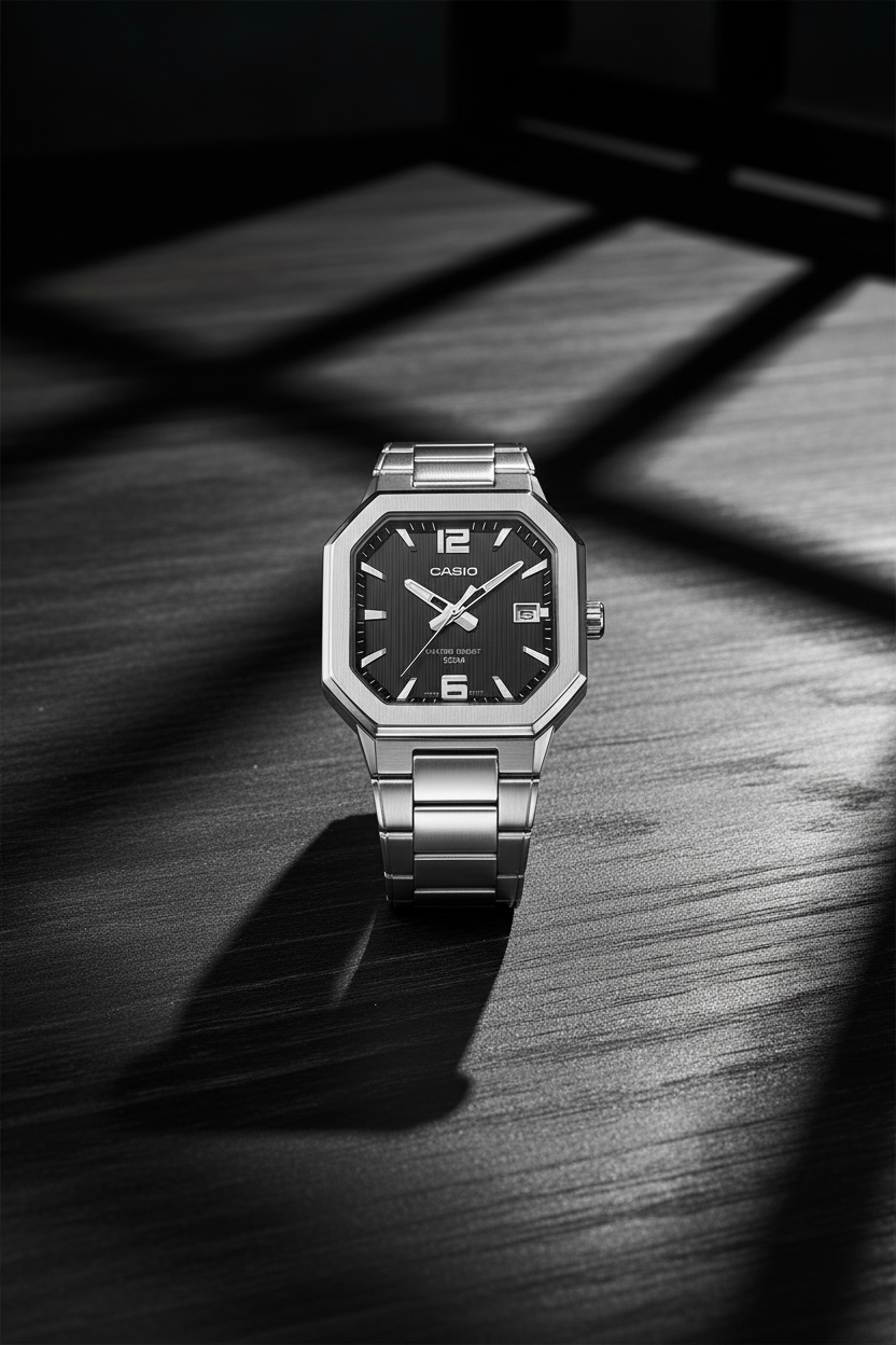 | Funciones especiales | Esfera negra sunburst con textura y acabado cepillado, numeración arábiga en posición 12 y 6 en fuente contemporánea renovada, manecillas voluminosas con alto contraste plateado; bisel octagonal de acero inoxidable plateado con textura metálica detallada y líneas angulares, caja y correa de acero inoxidable plateada con acabado combinado pulido y cepillado, cierre de triple pliegue de un solo toque con eslabones removibles para ajuste de talla, cristal mineral resistente a rayaduras; dimensiones 46,5 × 38 × 8,3 mm y peso de 114 g; versión esfera negra con brazalete del MTP-B195D, lanzamiento 2025/2026. |