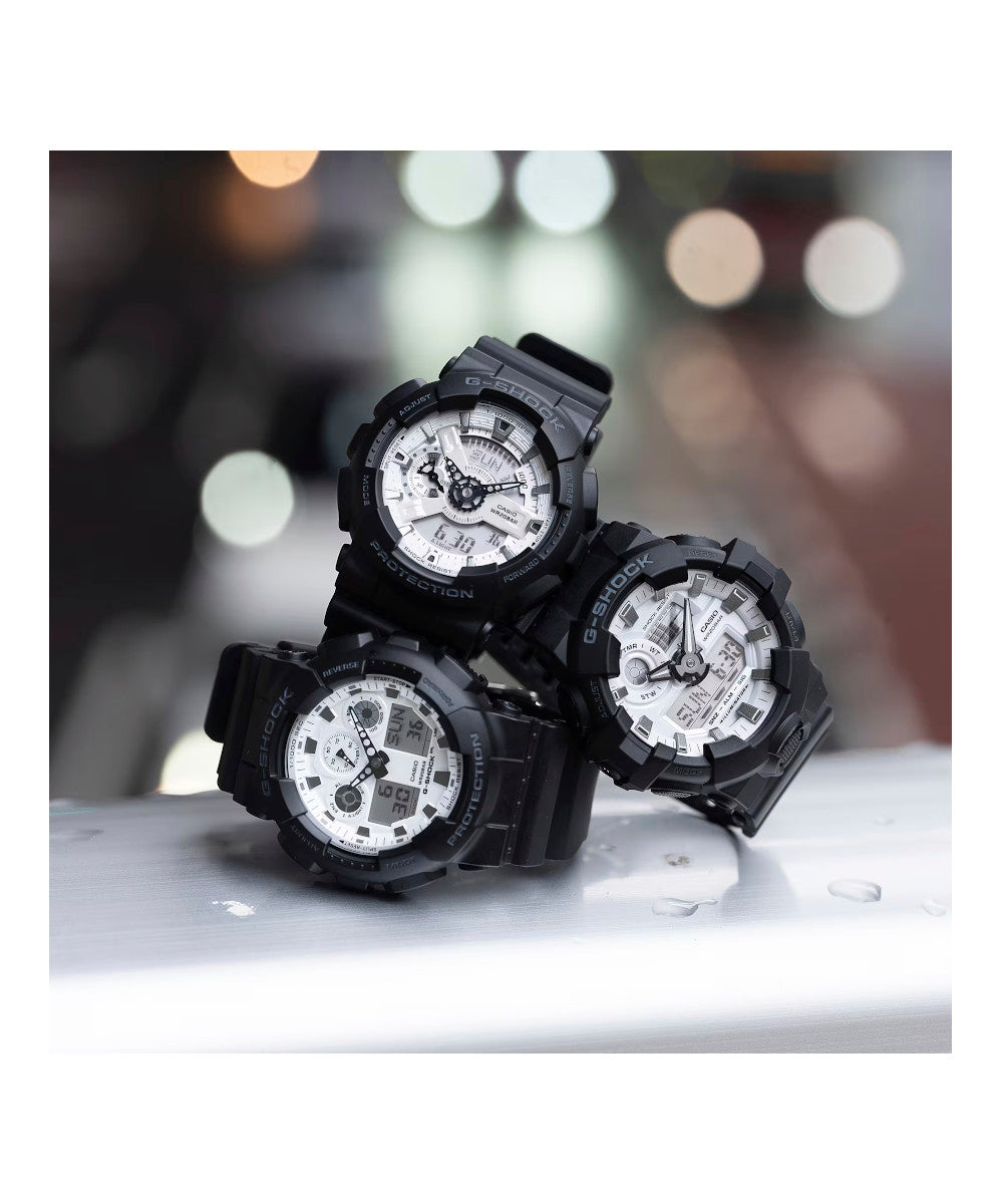 FUNCIONES: RELOJ G-SHOCK, Equipado con un cronómetro de medición en milisegundos, un velocímetro y resistencia magnética de clase 1 de la norma JIS. Las piezas pequeñas tridimensionales en forma de engranaje se montan en el dial, que fusiona pantallas analógicas y digitales, y presenta indicadores brillantes plateados que hacen que el diseño se destaque con mayor nitidez.