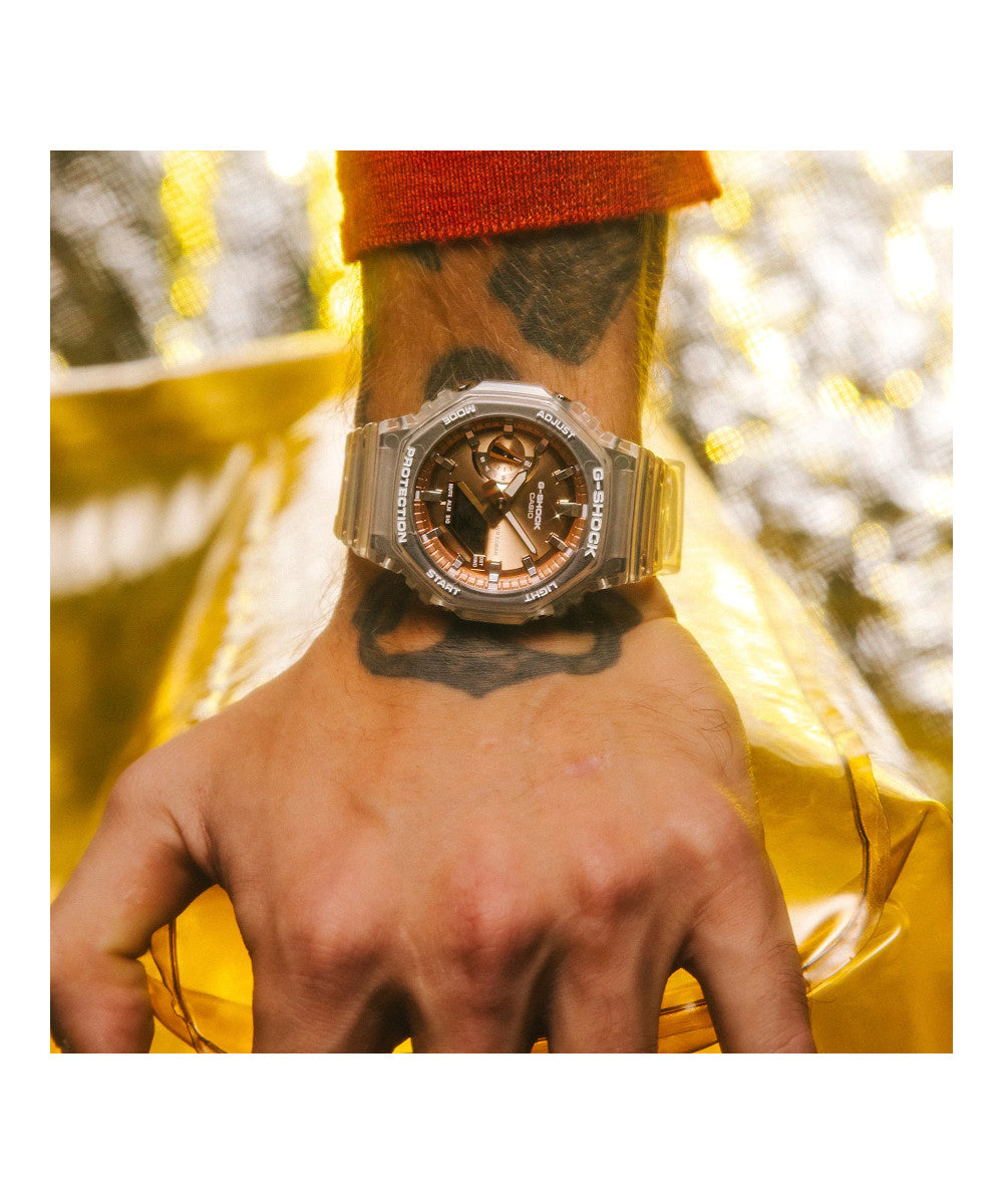 El Casio G-SHOCK GA-2100BM-7A5DR luce un diseño moderno en rosado con detalles metálicos. Delgado, ligero y resistente al agua 200 m, combina elegancia y durabilidad con funciones prácticas como hora mundial, alarmas y cronómetro.