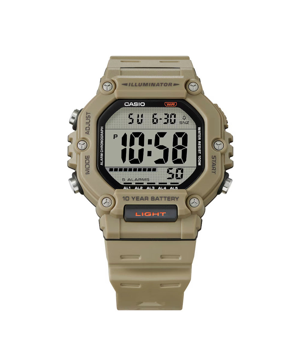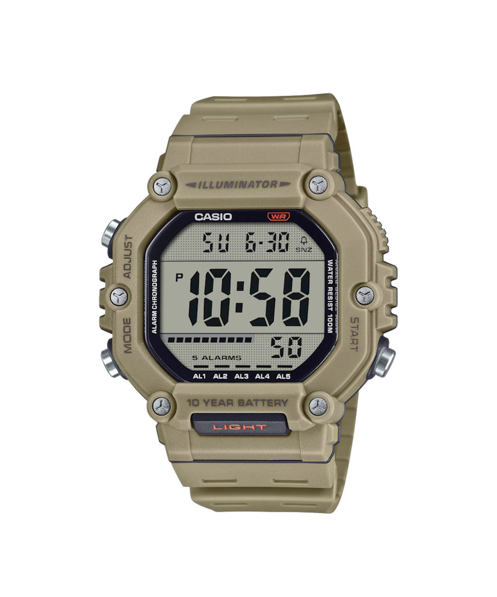 El Casio AE-1600H-5AVDF en tono café combina estilo y funcionalidad. Con batería de 10 años, resistencia al agua de 100 m y funciones como hora mundial, cronómetro y alarmas, es un reloj confiable y deportivo para uso diario.
