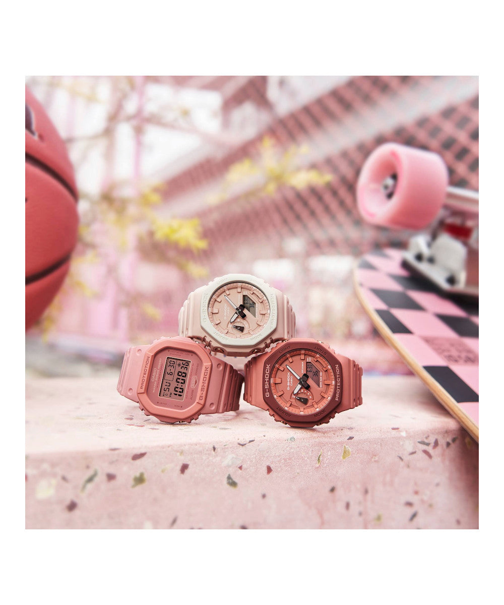 Explore los placeres tranquilos de un jardín en rosa G-SHOCK. Elija el icónico 5600 o el octogonal 2100 en dos diseños diferentes, todos en encantadoras combinaciones de tonos rosados ​​para una apariencia dulce y elegante.