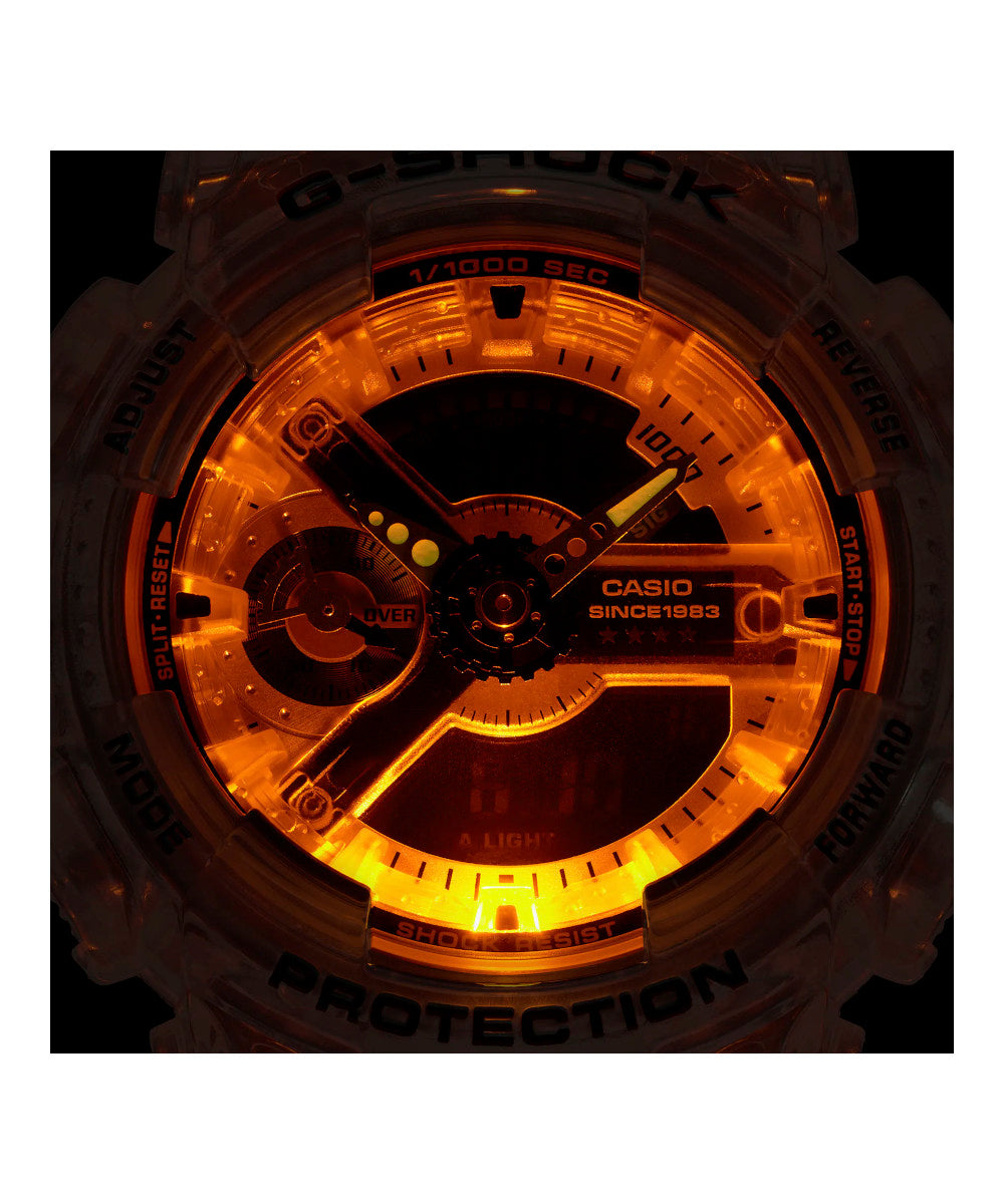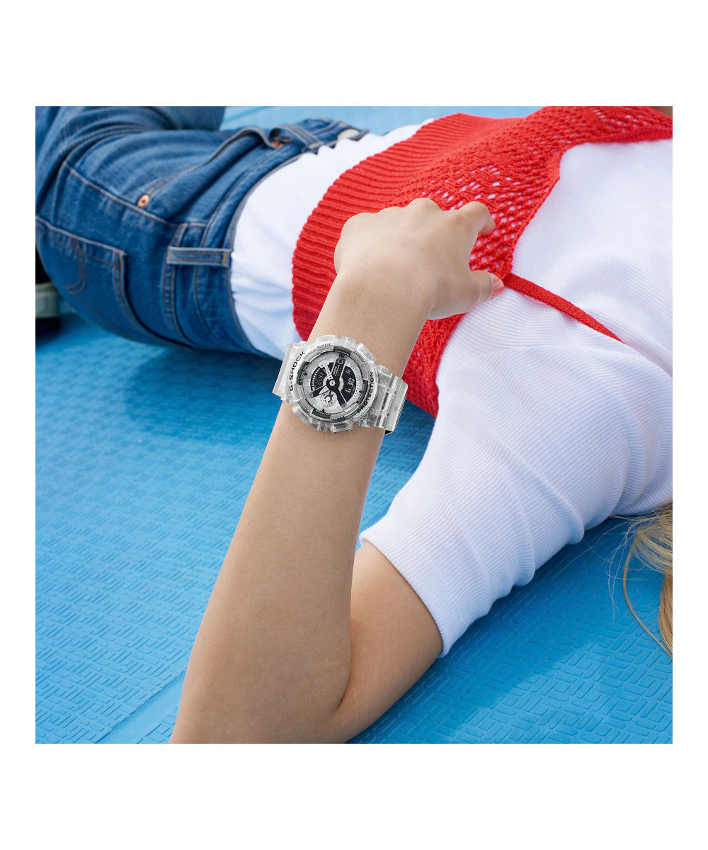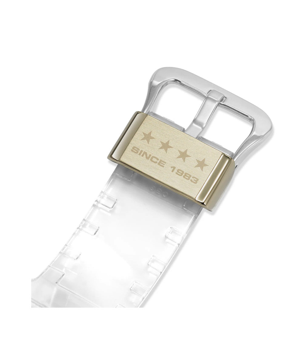 Exprésese sin complejos con la línea Clear Remix del 40.º aniversario de G-SHOCK: diseños de G-SHOCK populares deconstruidos con componentes transparentes para obtener el aspecto más translúcido hasta ahora. Los materiales transparentes de la correa, la carcasa, el dial, la pantalla LCD y los botones proporcionan una vista interna del sustrato del módulo impreso con la marca G y el logotipo de G-SHOCK. La parte posterior de la carcasa cuenta con el logotipo del 40.º aniversario diseñado por Eric Haze y el sujetador de la correa tiene grabadas cuatro estrellas en reconocimiento a este especial aniversario. Estos detalles y el uso sin precedentes de una carcasa transparente hecha de diamida de fibra de vidrio transparente ofrecen un diseño singular digno de un excepcional G-SHOCK de edición limitada. La nueva línea incluye relojes modelados que se basan en varios relojes G-SHOCK icónicos: el primer G-SHOCK, el DW-5000; el DW-5600 clásico digital; el DW-6900 con un distintivo diseño de botón frontal; el GA-2100/GMA-S2100 o el GA-110/GMA-S110, que se puede usar solo o como parte de un conjunto. Carcasa transparente: DW-6940RX, GA-114RX, GMA-S114RX Dial transparente: DW-6940RX, GA-114RX, GMA-S114RX, GA-2140RX, GMA-S2140RX Pantalla LCD transparente*: DW-5040RX, DWE-5640RX, DW-6940RX Botones transparentes: GA-114RX, GMA-S114RX * La pantalla digital puede ser difícil de leer en determinados ángulos de visualización debido a los materiales transparentes utilizados en la pantalla LCD.