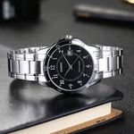 Funciones especiales Esfera negra con marcadores plateados, caja y correa de acero inoxidable pulido, cristal mineral resistente, cierre de triple pliegue seguro