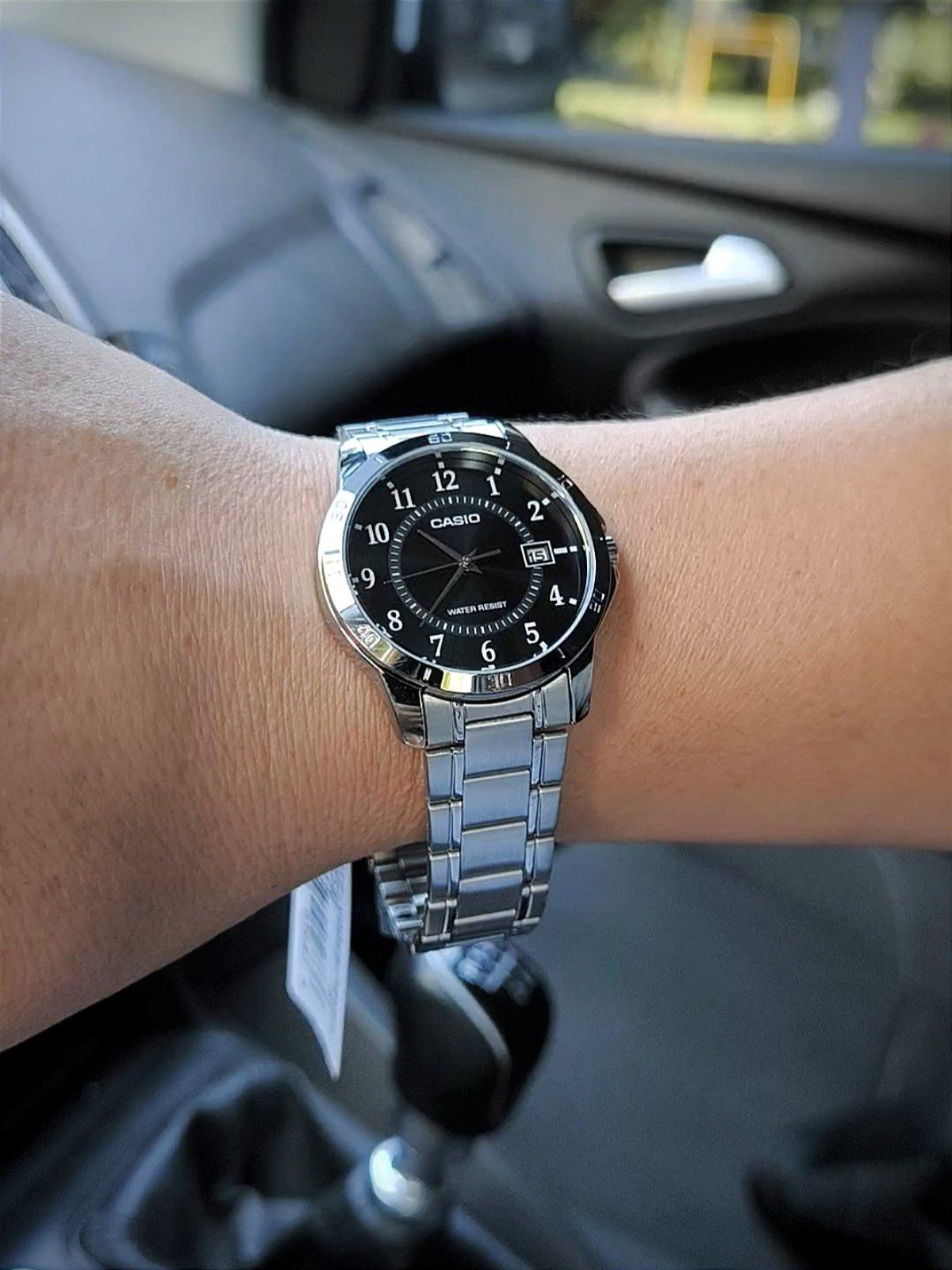 Casio MTP-V004D-1BUDF para hombre. Esfera negra, caja y correa de acero, calendario y movimiento de cuarzo. Diseño clásico y elegante, perfecto para uso diario o complementar un estilo formal.
