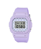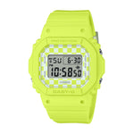Reloj Casio Baby-G BGD-565GS-9DR digital para mujer con diseño urbano inspirado en la cultura del skateboarding, motivo de bandera a cuadros en caja y correa de resina verde, cristal mineral, resistencia a impactos y al agua 100 m, retroiluminación LED Super Illuminator, cronómetro, temporizador de cuenta regresiva, alarma y calendario automático.