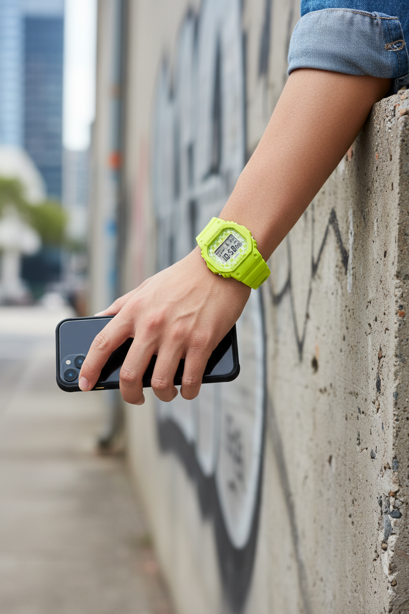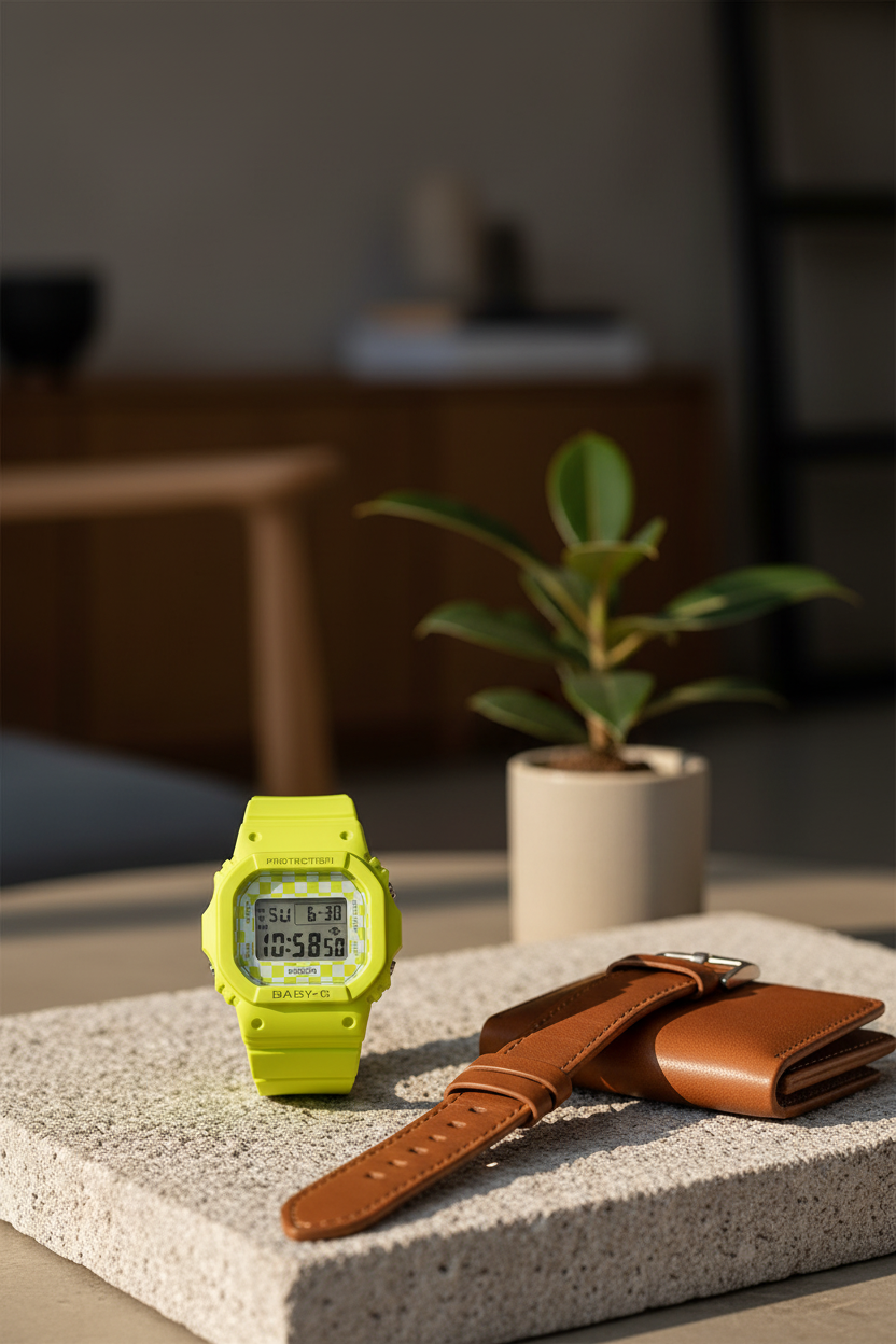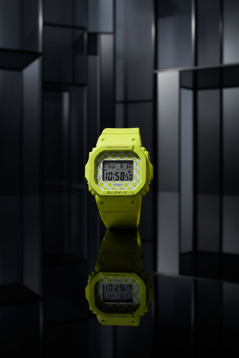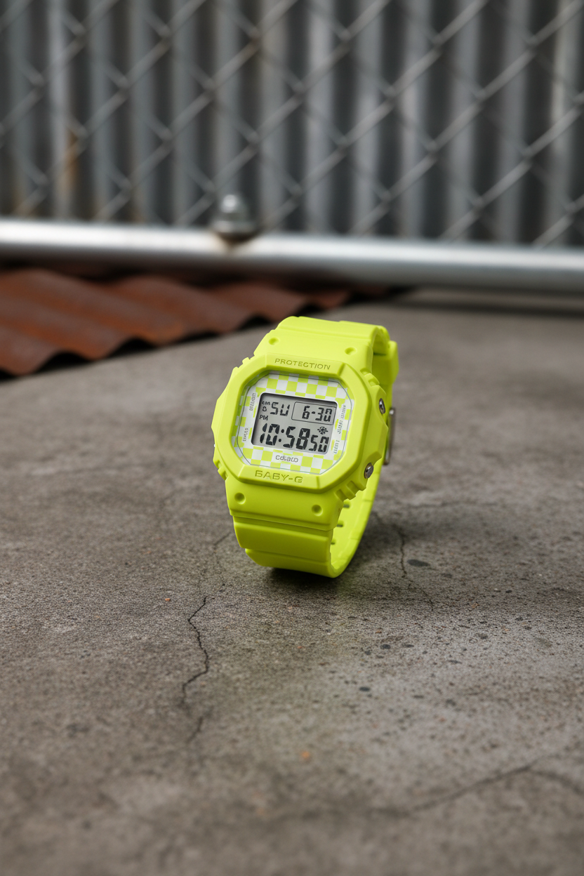 | Funciones especiales | Diseño Baby-G inspirado en la cultura del skateboarding con motivo de bandera a cuadros, caja y correa de resina verde claro con pantalla digital en blanco y verde, cristal mineral, retroiluminación electroluminiscente (EL) de color azul-verde con persistencia, resistencia a impactos; dimensiones 42,1 × 37,9 × 11,3 mm y peso de 30 g; estilo urbano casual compacto y ligero, ideal para muñecas pequeñas. |