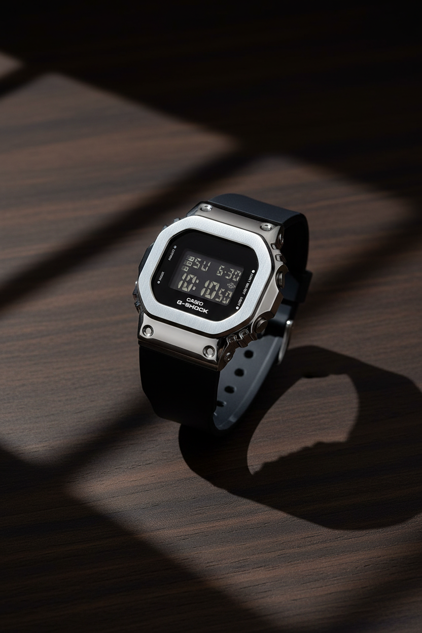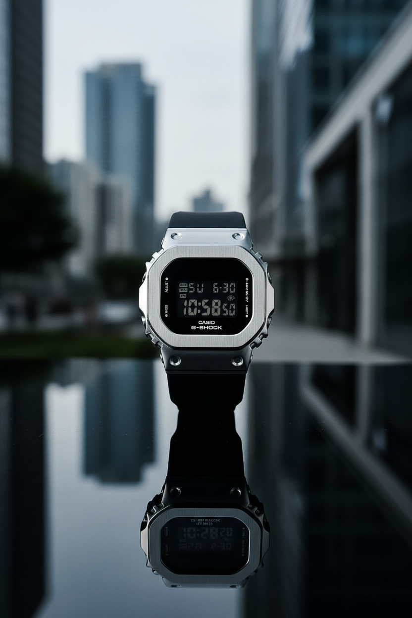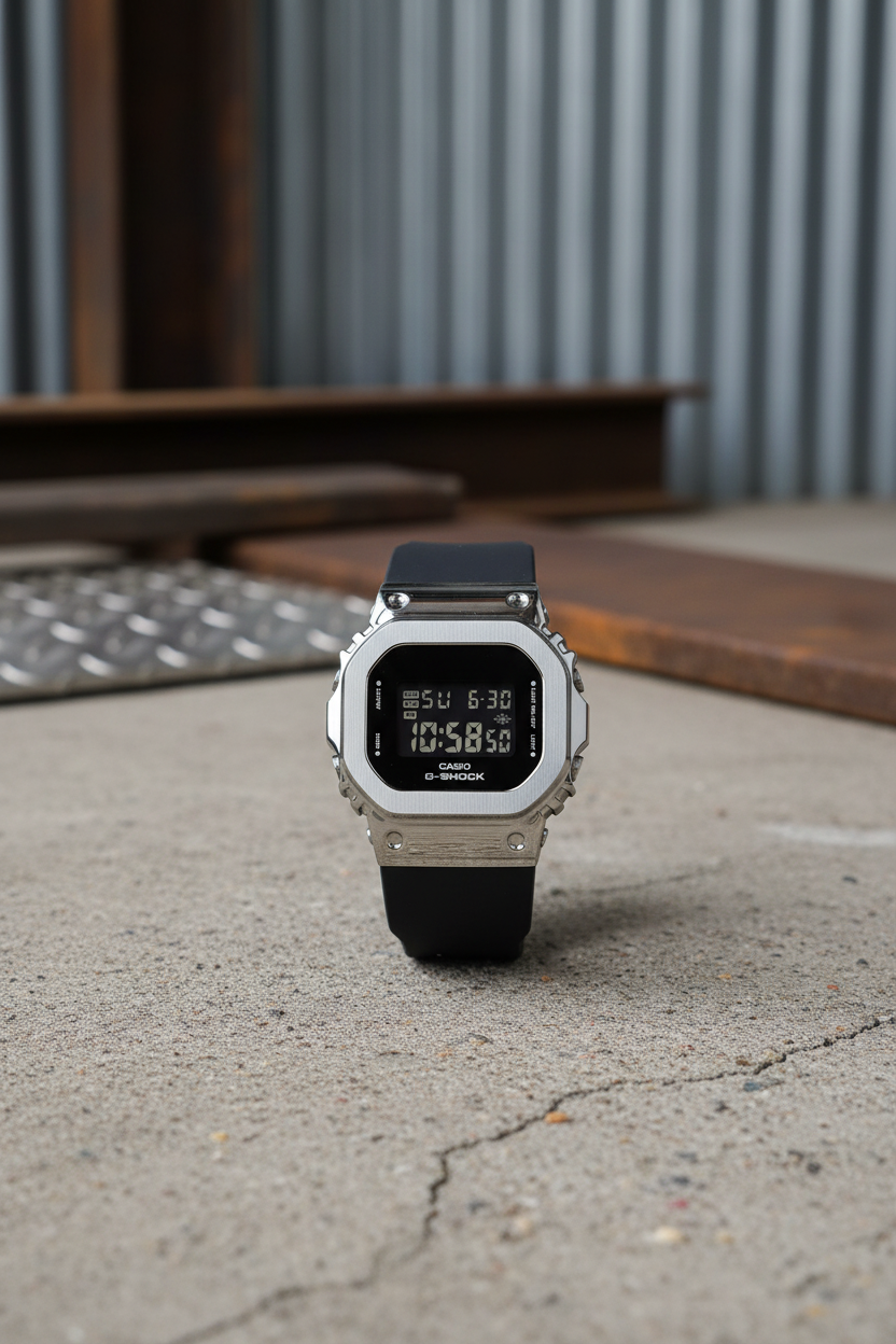 | Funciones especiales | Versión compacta del icónico G-SHOCK cuadrado con bisel de acero inoxidable plateado pulido sobre caja de resina negra, pantalla LCD negativa de alto contraste, correa de resina negra con hebilla, cristal mineral, resistencia a impactos, luz LED Super Illuminator de alta luminosidad con persistencia, alerta luminosa (flash alert); tamaño 43,8 × 38,4 × 10,9 mm y peso de 50 g, diseño más pequeño y delgado especialmente adaptado para muñecas finas. |
