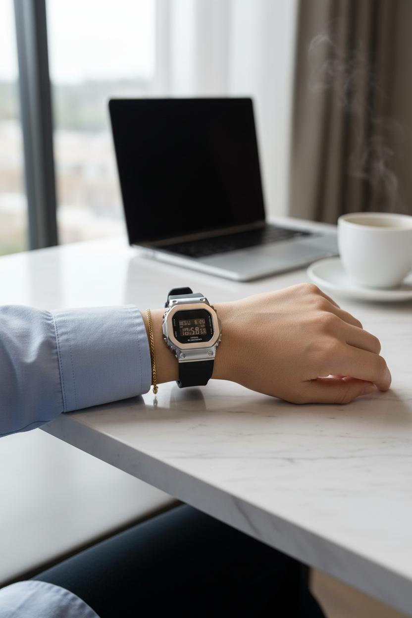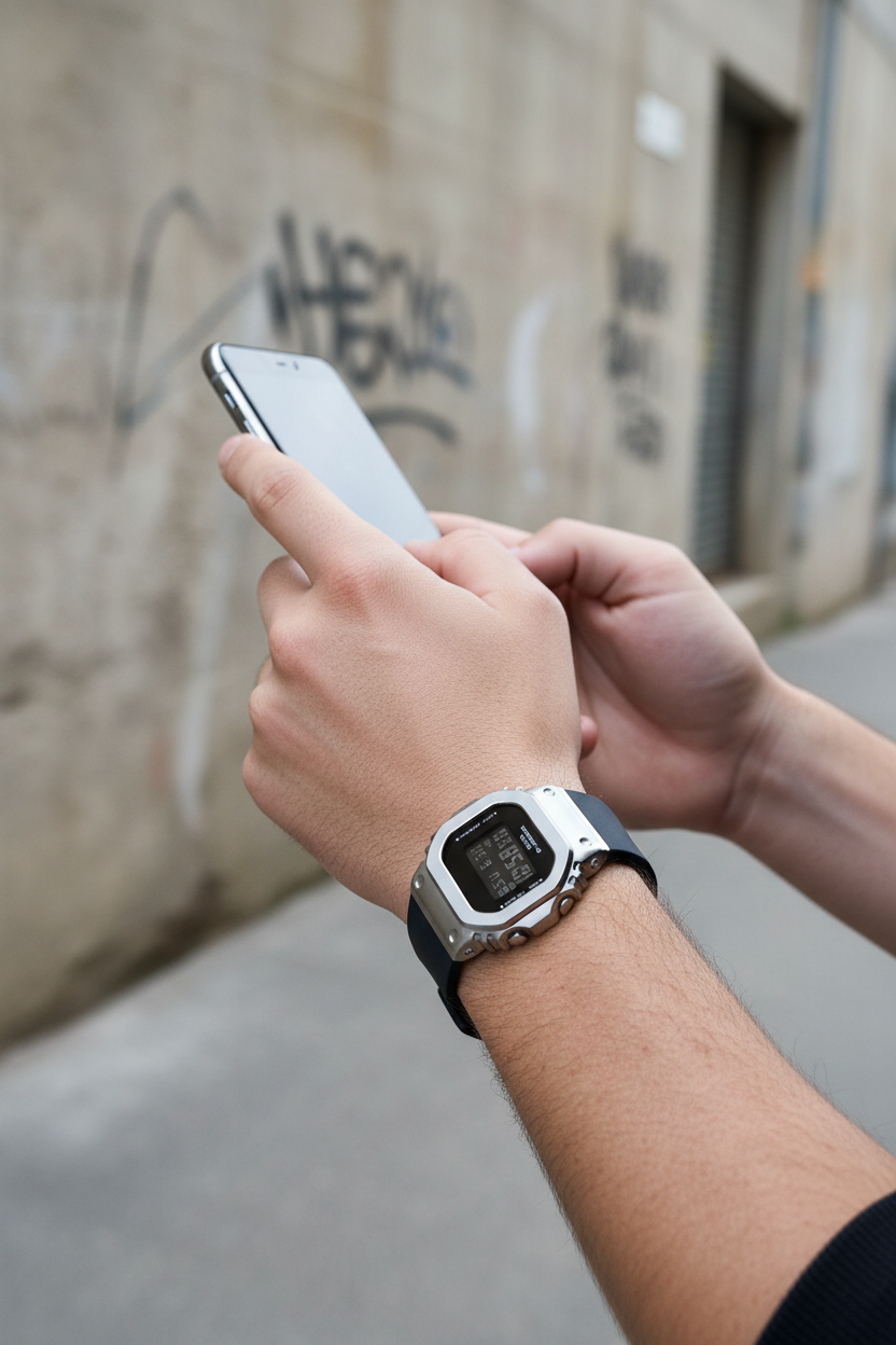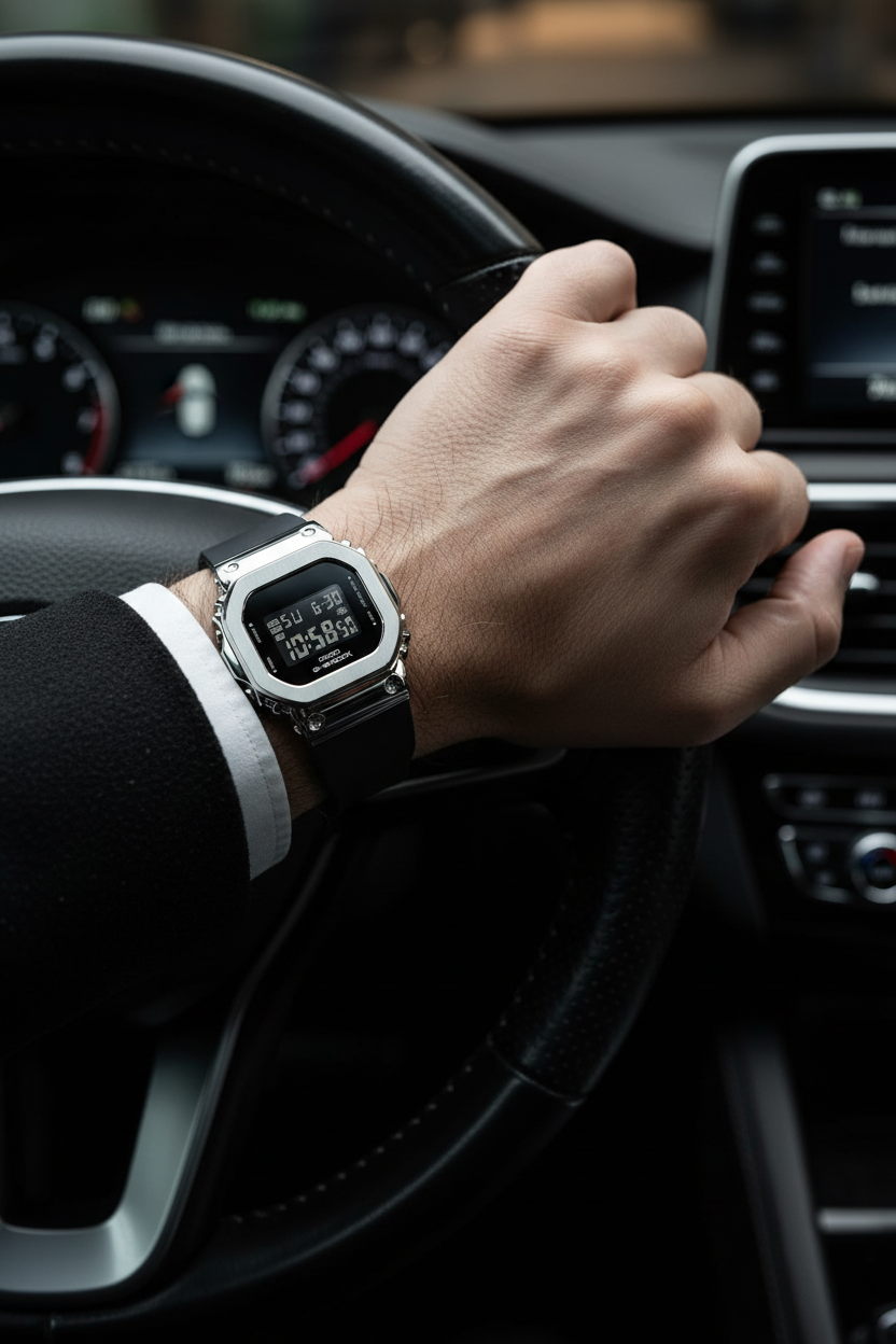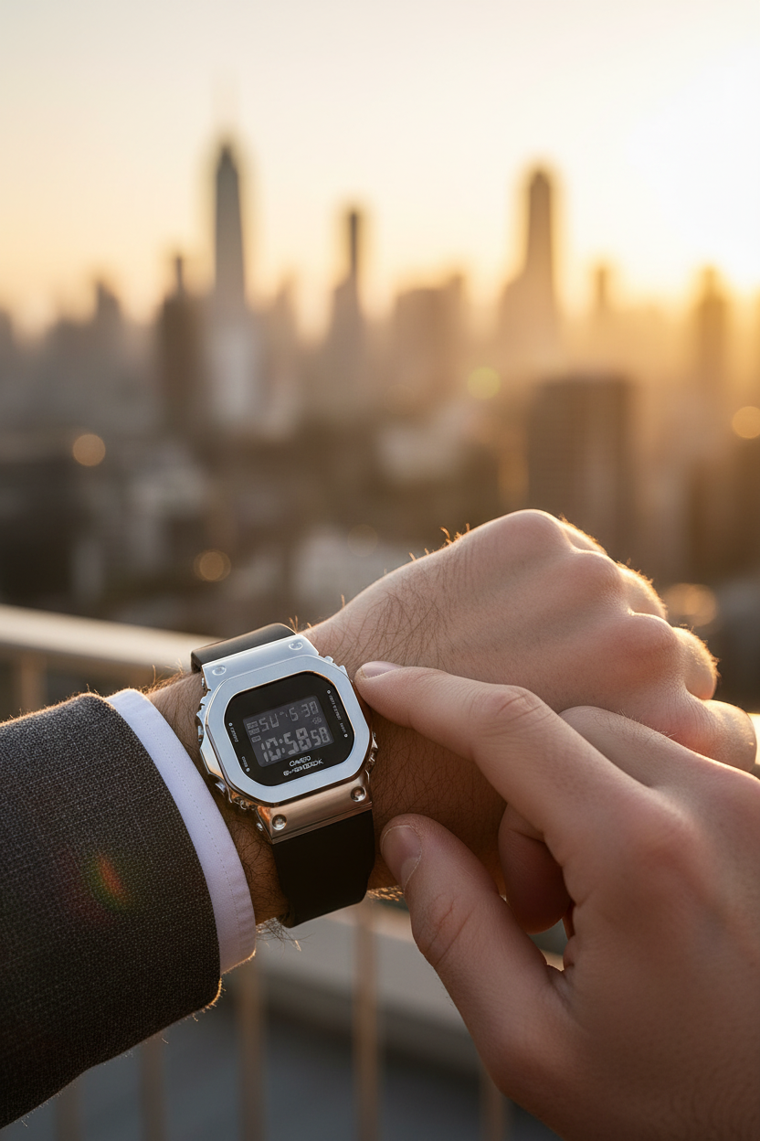 | Funciones especiales | Versión compacta del icónico G-SHOCK cuadrado con bisel de acero inoxidable plateado pulido sobre caja de resina negra, pantalla LCD negativa de alto contraste, correa de resina negra con hebilla, cristal mineral, resistencia a impactos, luz LED Super Illuminator de alta luminosidad con persistencia, alerta luminosa (flash alert); tamaño 43,8 × 38,4 × 10,9 mm y peso de 50 g, diseño más pequeño y delgado especialmente adaptado para muñecas finas. |