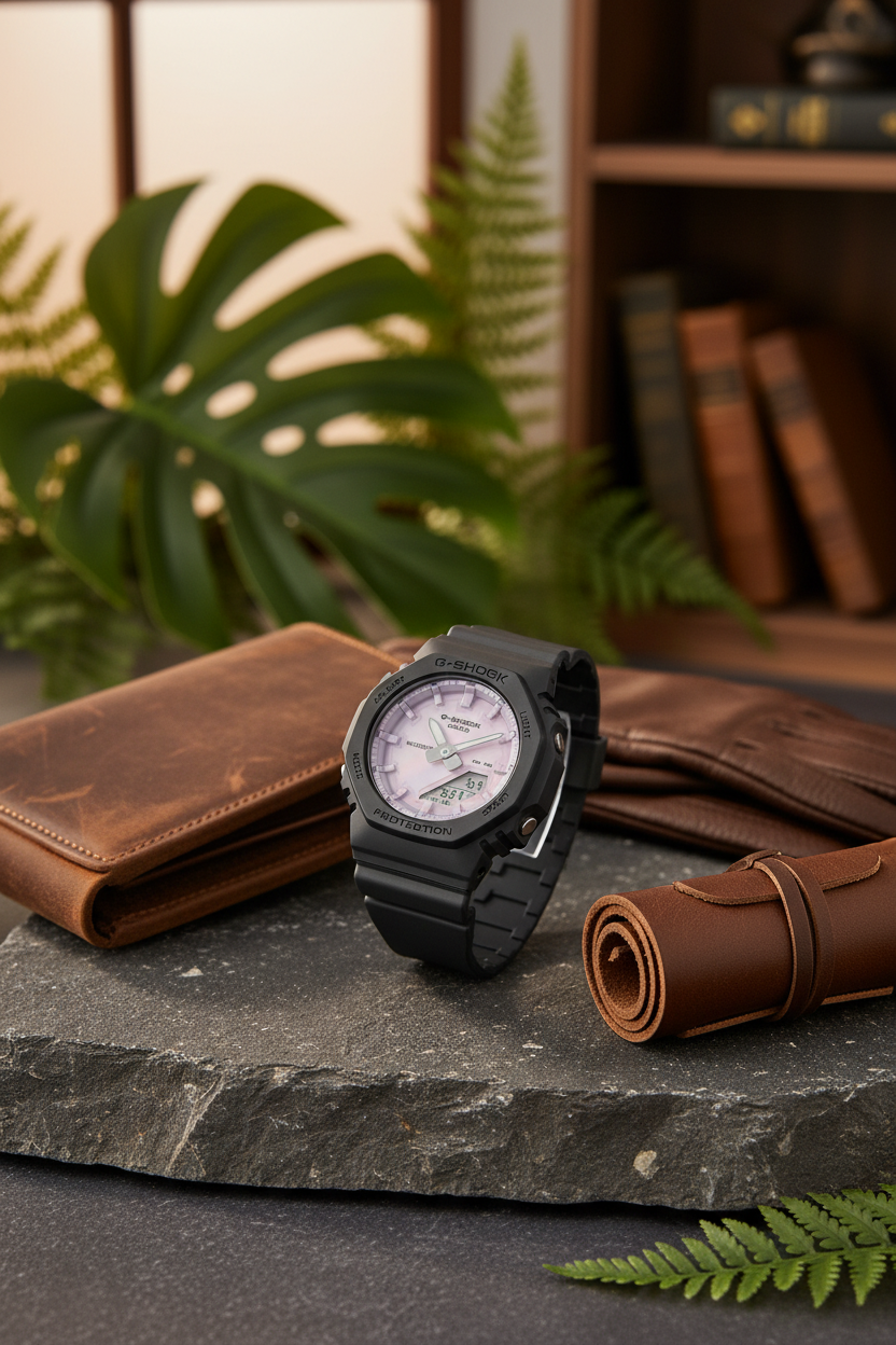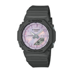 | Funciones especiales | Caja y correa de resina de base biológica en color negro mate con bisel octogonal, esfera con dial polarizado en tonos morado/rosa que cambia de color según el ángulo, índices con acabado brillante, cristal mineral, resistencia a impactos G‑SHOCK, doble luz LED Super Illuminator (para parte analógica y digital) y función de desplazamiento de agujas; dimensiones aproximadas de 46 × 40,2 × 11,2 mm y peso de 40 g, tamaño compacto pensado para muñecas pequeñas. |