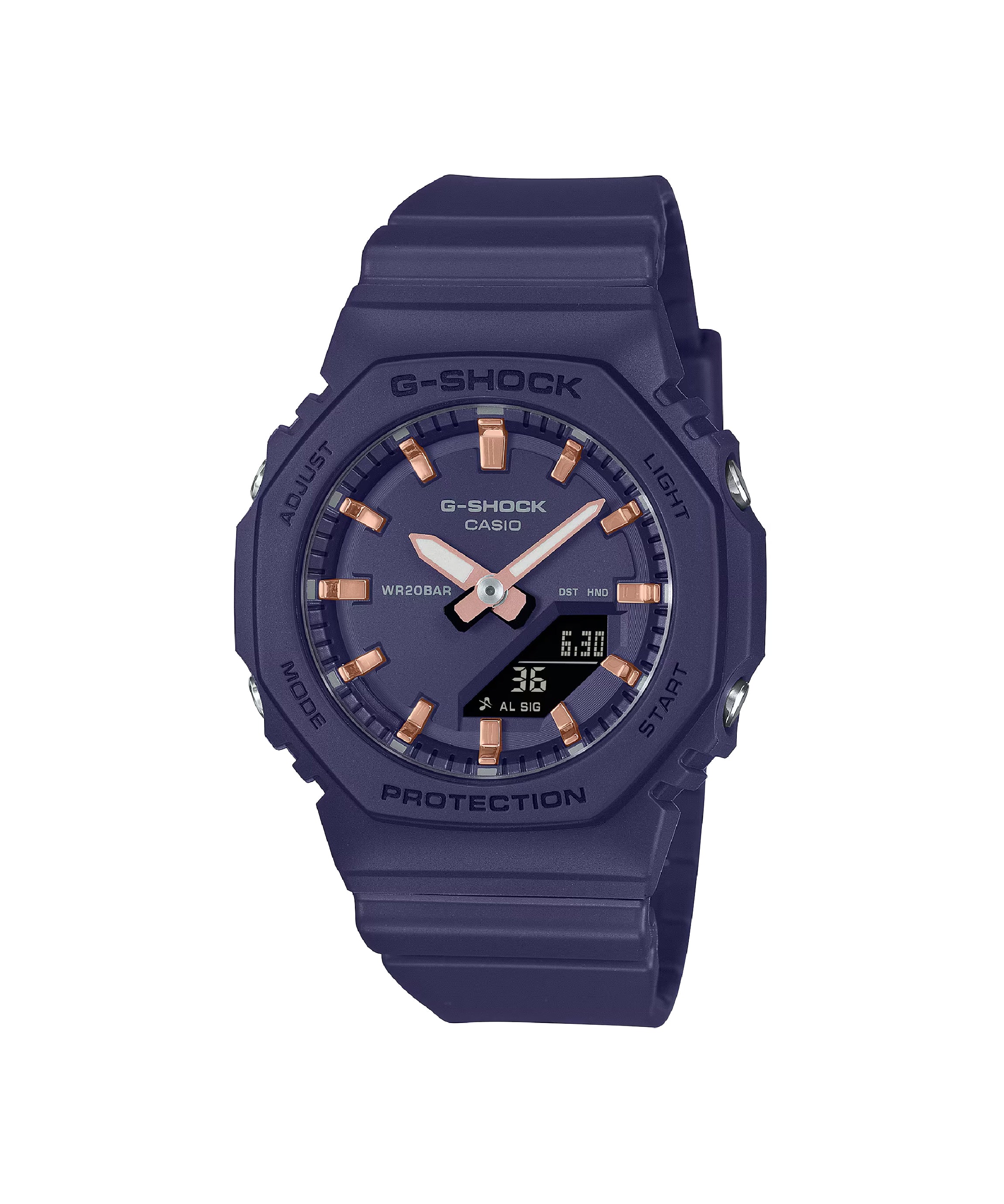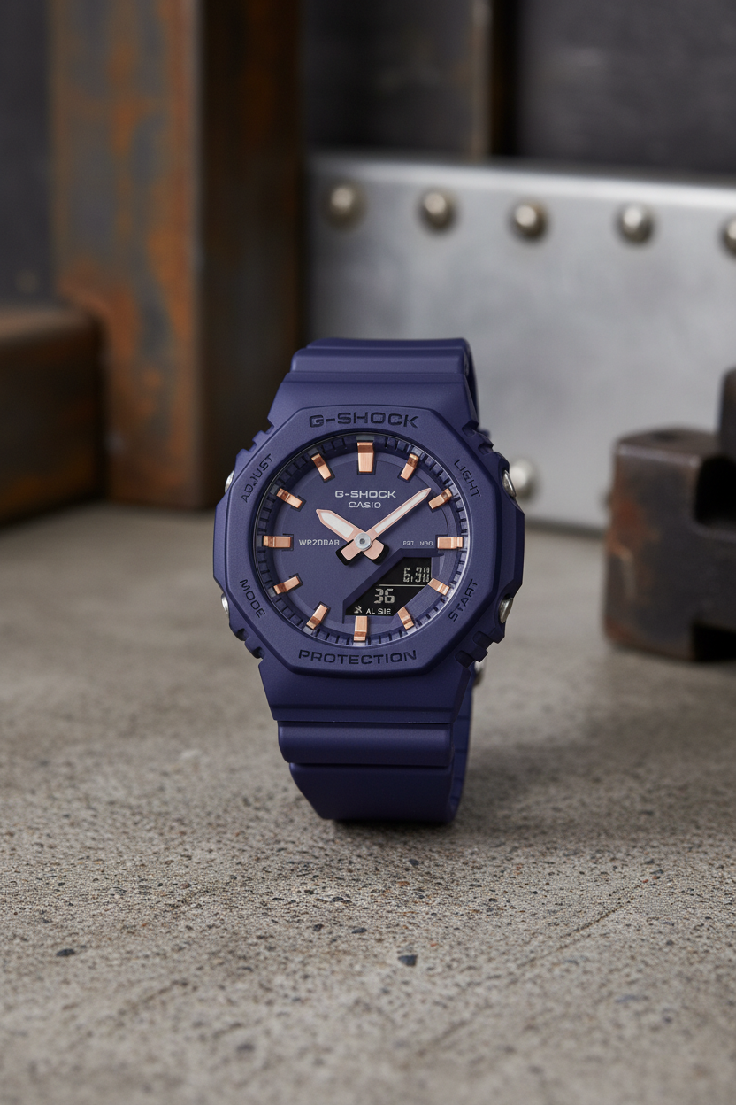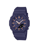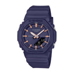 Reloj G-SHOCK GMA-P2100M-2ADR ana-digi compacto para mujer en resina azul marino con índices en acabado oro rosa, caja octogonal tipo “CasiOak”, resistente a impactos y al agua 200 m, con luz LED, hora mundial, cronómetro, temporizador y 5 alarmas diarias.
