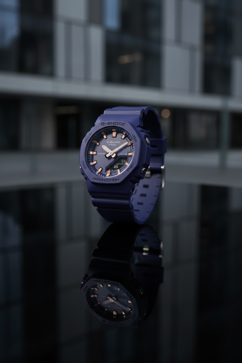 Funciones especiales Caja y correa de resina de origen biológico en azul marino, bisel octogonal tipo “CasiOak”, índices aplicados con acabado oro rosa, esfera azul/púrpura con efecto metálico, cristal mineral, resistencia a impactos G‑SHOCK, doble luz LED Super Illuminator (para parte analógica y digital), función de silencio (encendido/apagado del tono de botón) y función de desplazamiento de agujas; dimensiones aproximadas de 46 × 40,2 × 11,2 mm y peso cercano a 40 g, ideal para muñecas pequeñas.