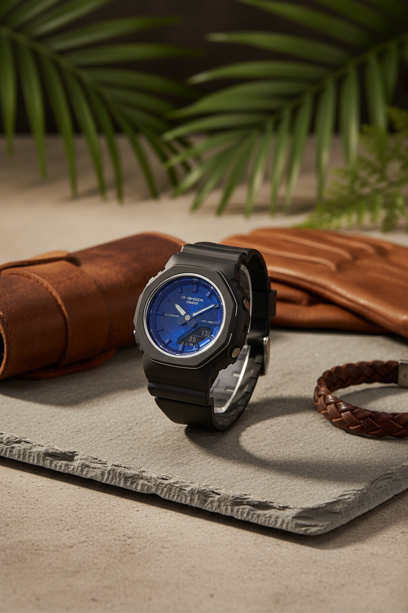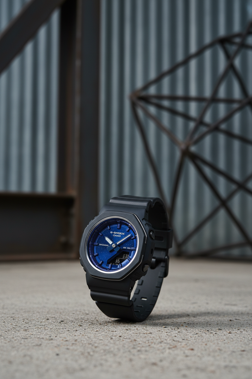 | Funciones especiales | Bisel octogonal con aro metálico, caja y correa de resina de base biológica, esfera azul marino con degradado y efecto nacarado inspirada en el lapislázuli (símbolo de buena fortuna), cristal mineral, manos con Neobrite luminosa, doble luz LED Super Illuminator (para parte analógica y digital), función de desplazamiento de agujas, tono de botón activable/desactivable; dimensiones aproximadas 46 × 40,5 × 11,3 mm y peso cercano a 37–40 g, en un tamaño compacto tipo “CasiOak” pensado para muñecas pequeñas. |