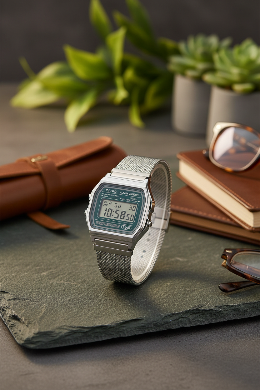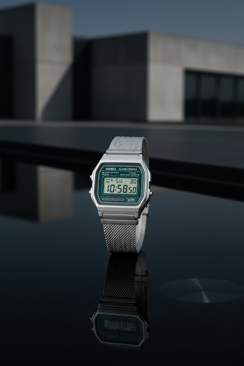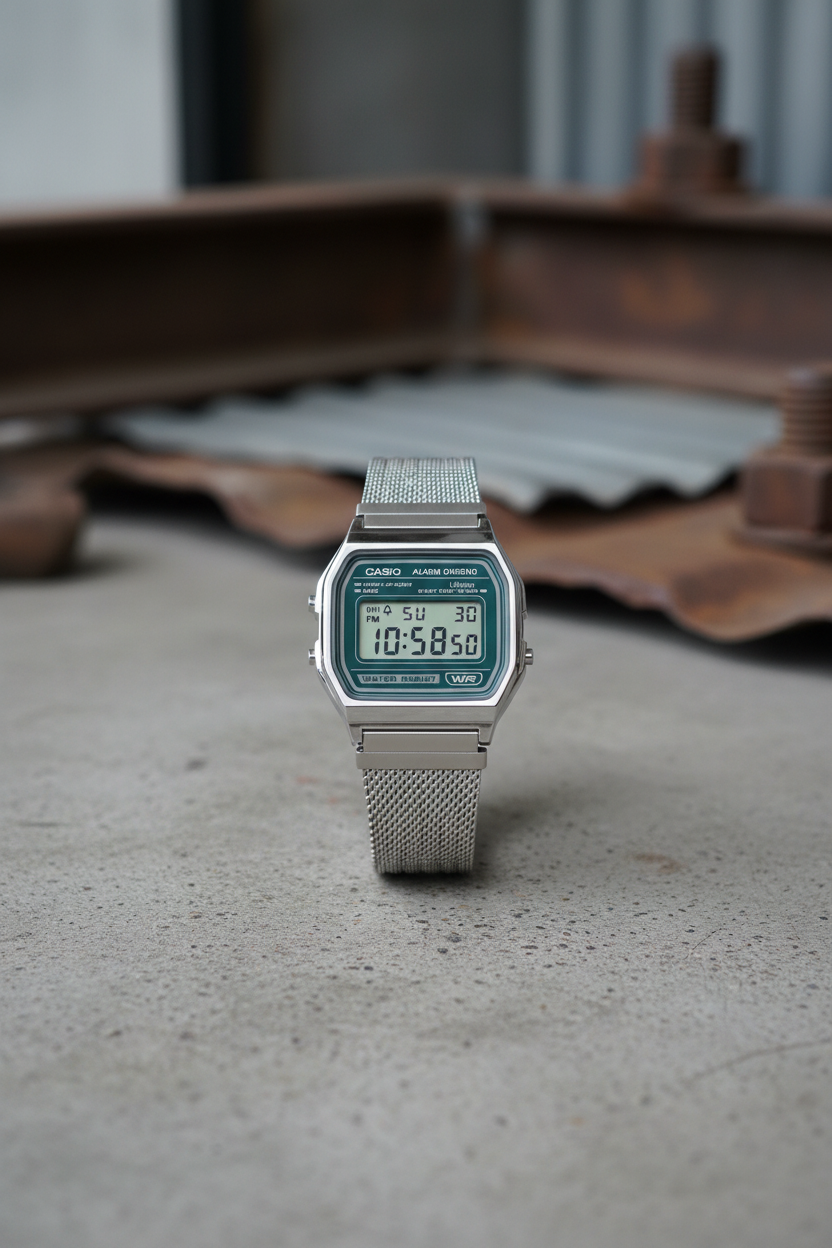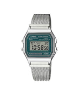 | Funciones especiales | Versión hermana del A158WEM-7 con esfera digital de fondo verde oscuro sobre caja cuadrada de resina plateada cromada; correa de malla de acero inoxidable de tejido fino tratada con proceso de prensado especializado que añade profundidad y dimensión, con cierre autoajustable sin herramientas para muñecas de 150 a 205 mm, cristal de resina, retroiluminación LED verde con persistencia; dimensiones 36,8 × 33,2 × 8,5 mm y peso de 52 g; diseño unisex vintage clásico y elegante ideal para uso casual y de vestir. |