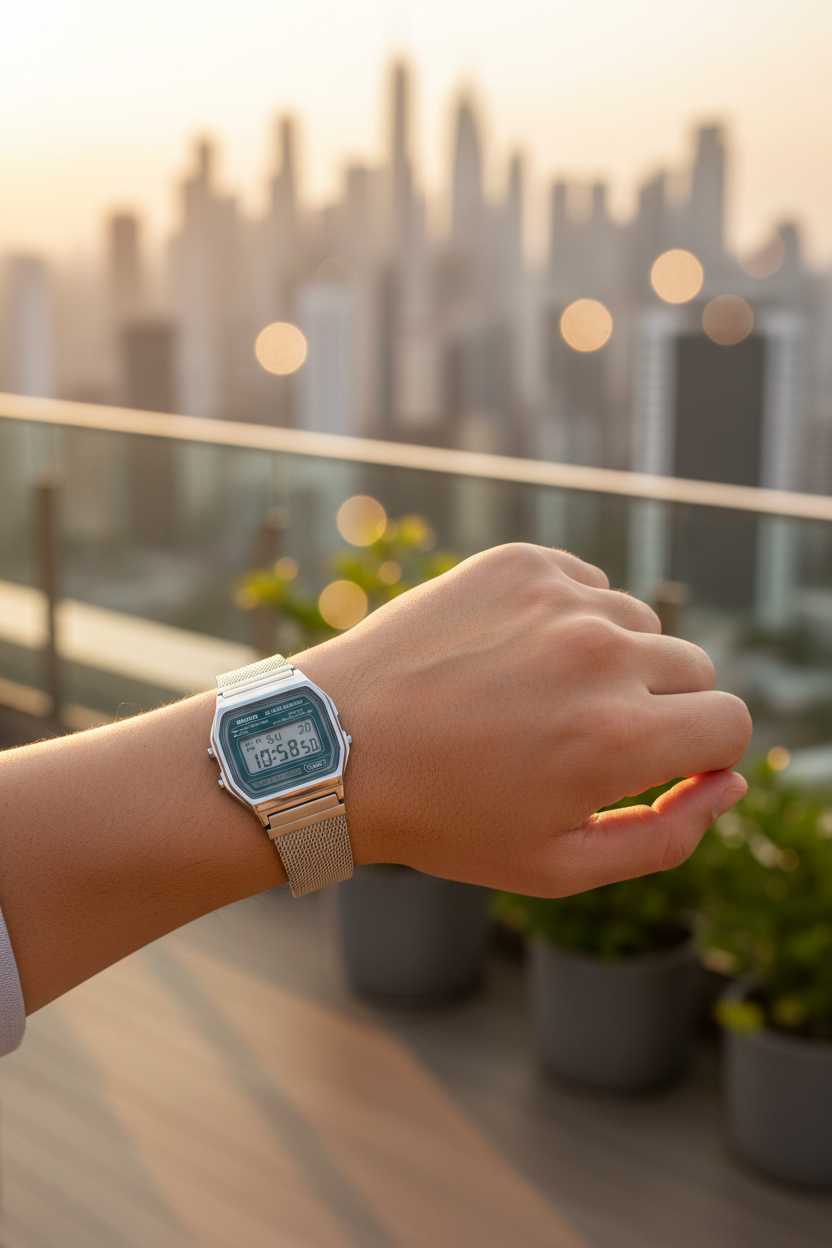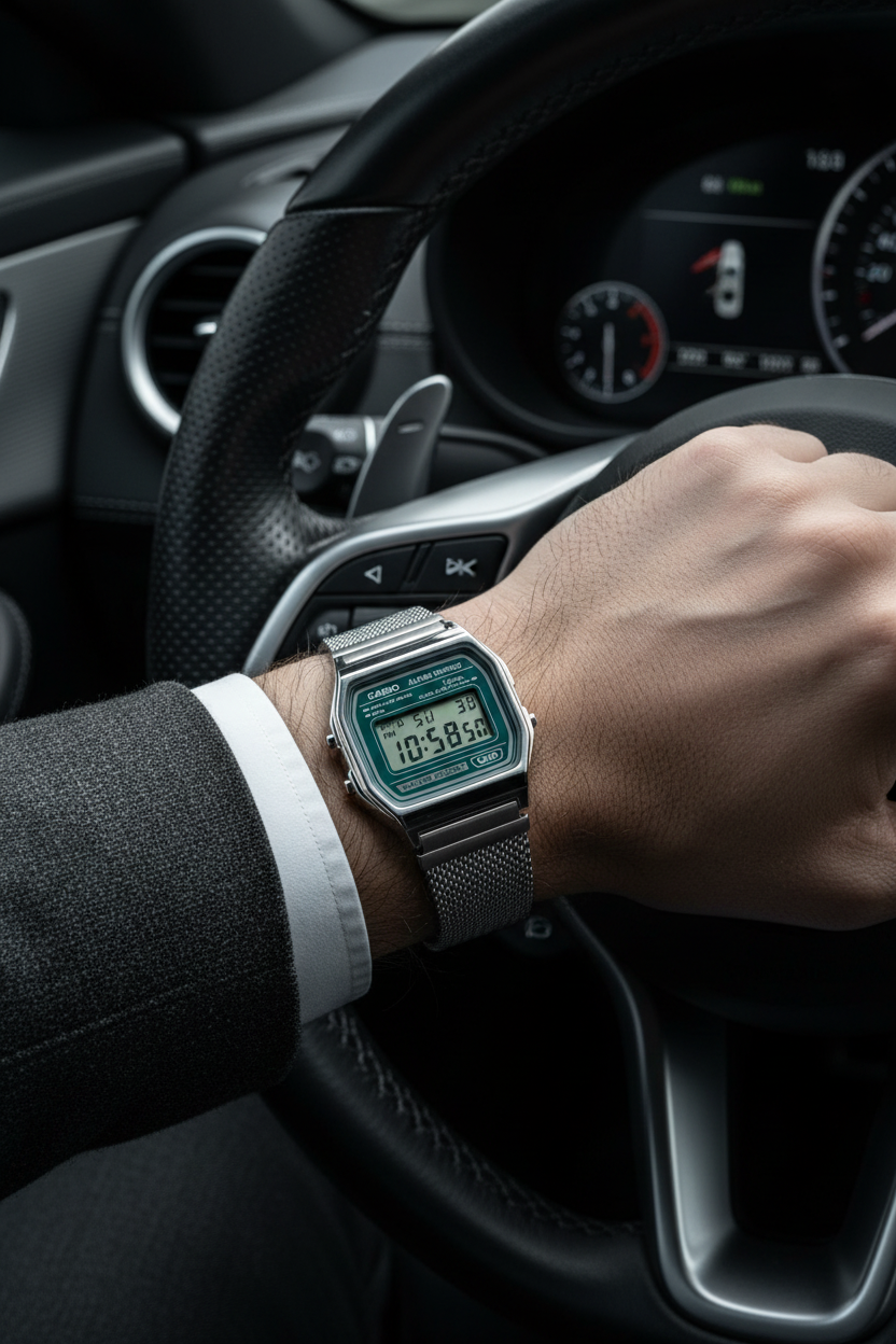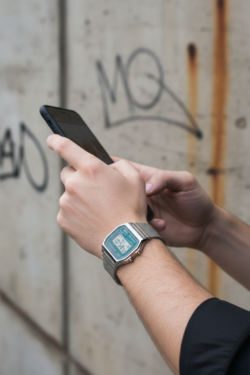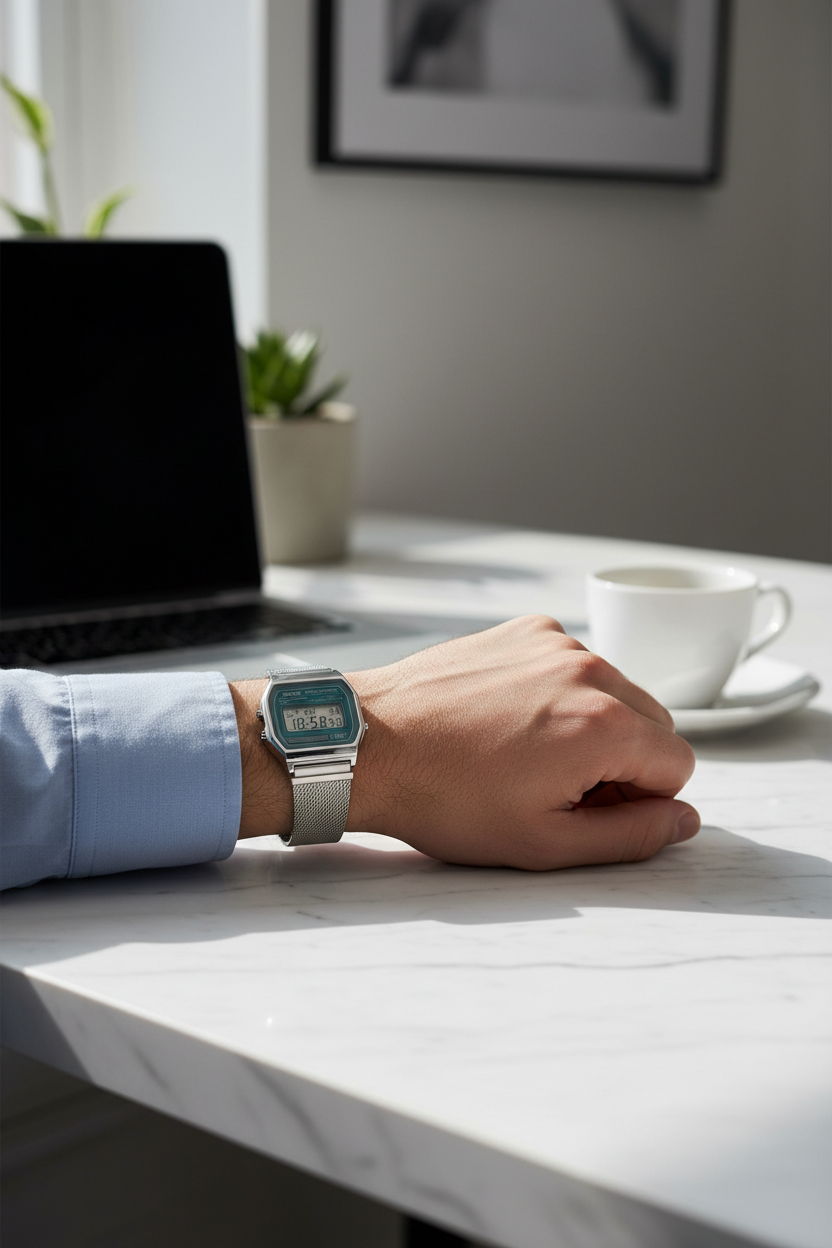 | Funciones especiales | Versión hermana del A158WEM-7 con esfera digital de fondo verde oscuro sobre caja cuadrada de resina plateada cromada; correa de malla de acero inoxidable de tejido fino tratada con proceso de prensado especializado que añade profundidad y dimensión, con cierre autoajustable sin herramientas para muñecas de 150 a 205 mm, cristal de resina, retroiluminación LED verde con persistencia; dimensiones 36,8 × 33,2 × 8,5 mm y peso de 52 g; diseño unisex vintage clásico y elegante ideal para uso casual y de vestir. |