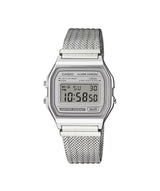 Reloj Casio Vintage A158WEM-3DF digital unisex, versión premium del icónico A158 con correa de malla de acero inoxidable de tejido fino tratada con proceso de prensado especializado, esfera gris claro (fondo plateado), caja cuadrada plateada de perfil delgado 8,2 mm, cierre ajustable, luz LED, cronómetro 1/100 seg, alarma diaria y resistente a salpicaduras.