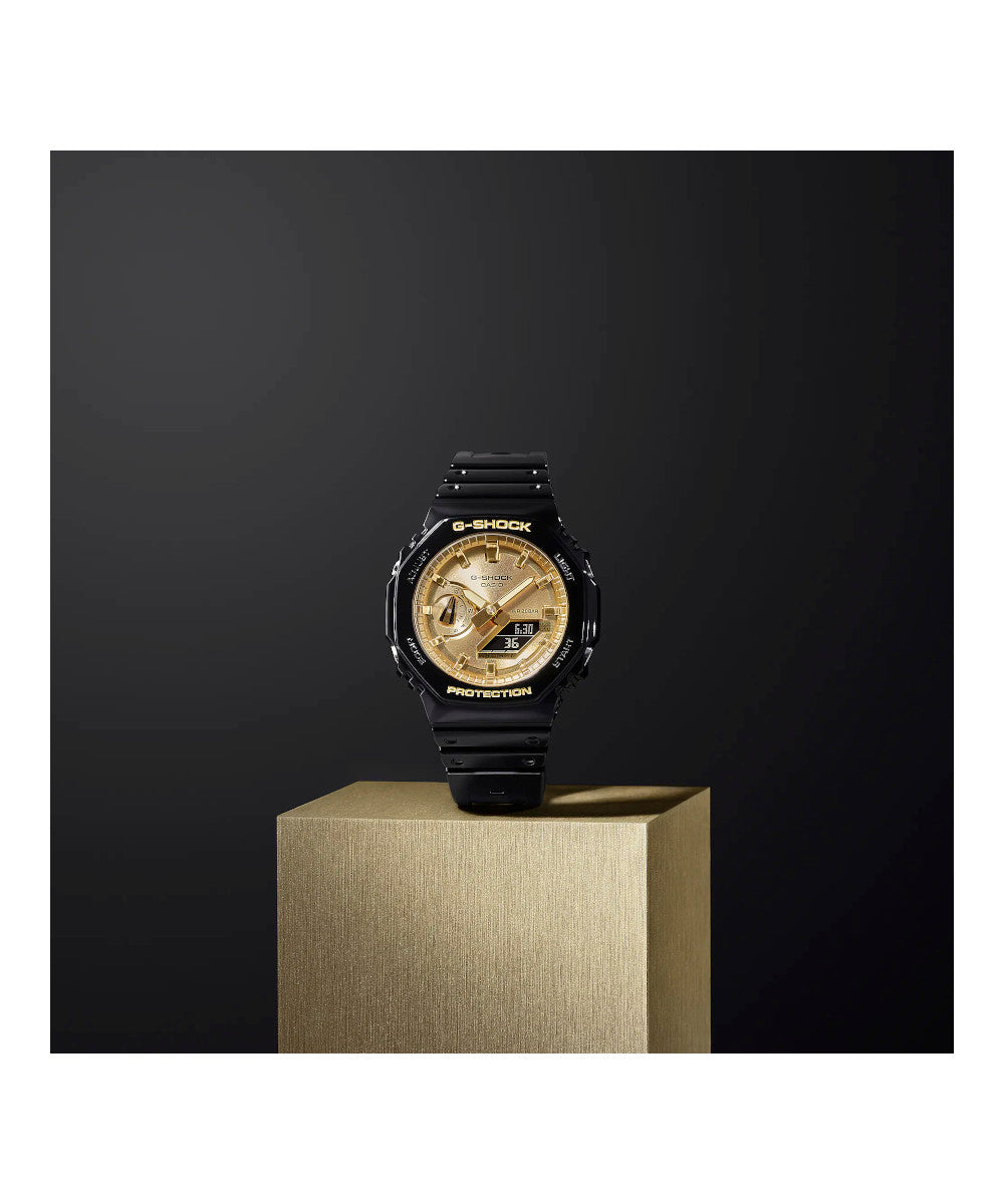 El GA-2100GB-1ADR combina el diseño icónico octogonal de G-SHOCK con un elegante acabado negro con detalles dorados. Ligero, resistente y minimalista, es ideal para quienes buscan estilo urbano y funcionalidad en un solo reloj.