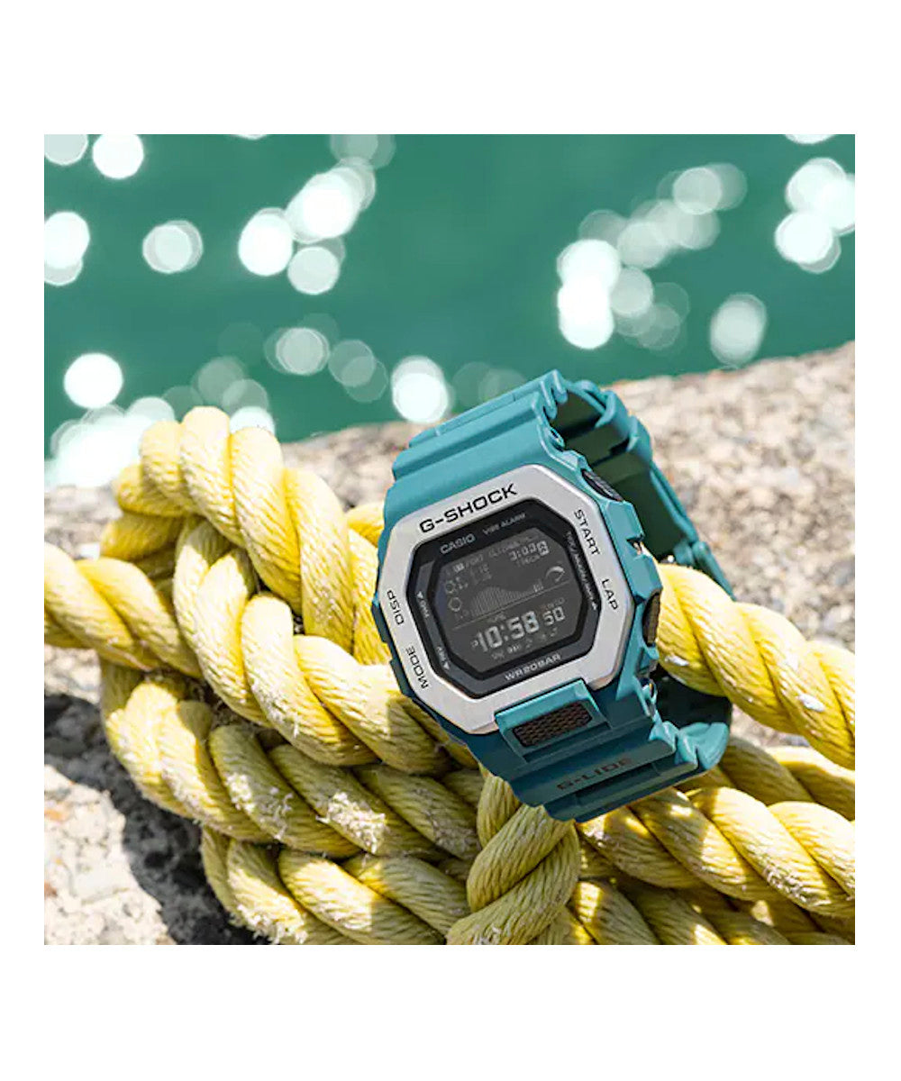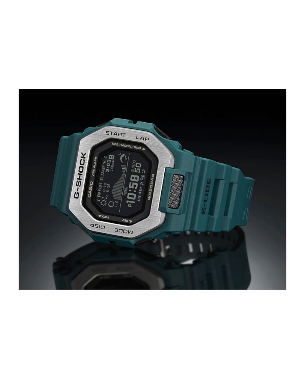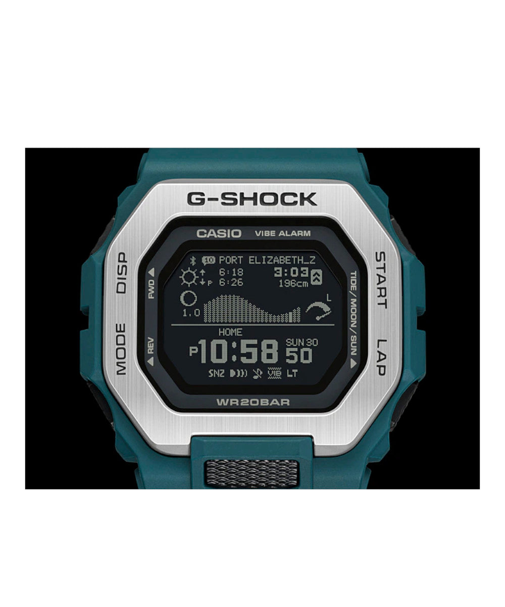 FUNCIONES: RELOJ G-SHOCK, resistencia al agua de 200 metros, resistente a impactos, cronómetro de 1/100 segundos, temporizador, formato de 12 y 24 horas, señal horaria, calendario automático 2099, Su capacidad de mostrar gráficos de mareas, datos lunares, niveles y horas de pleamar/bajamar y horas de salida/puesta del sol es útil para los surfistas, ya que les permite comprender el estado de la marea en detalle de un vistazo, que se combina bien con las funciones de medición de entrenamiento