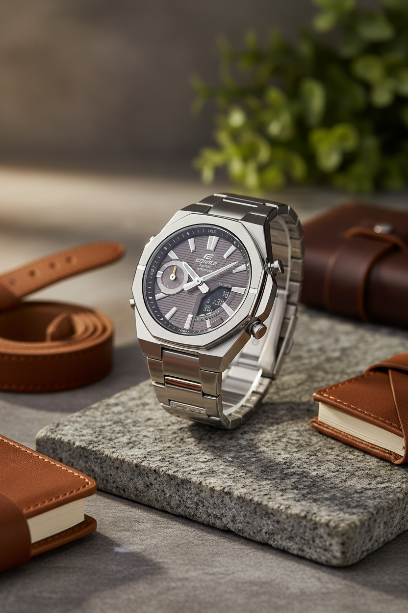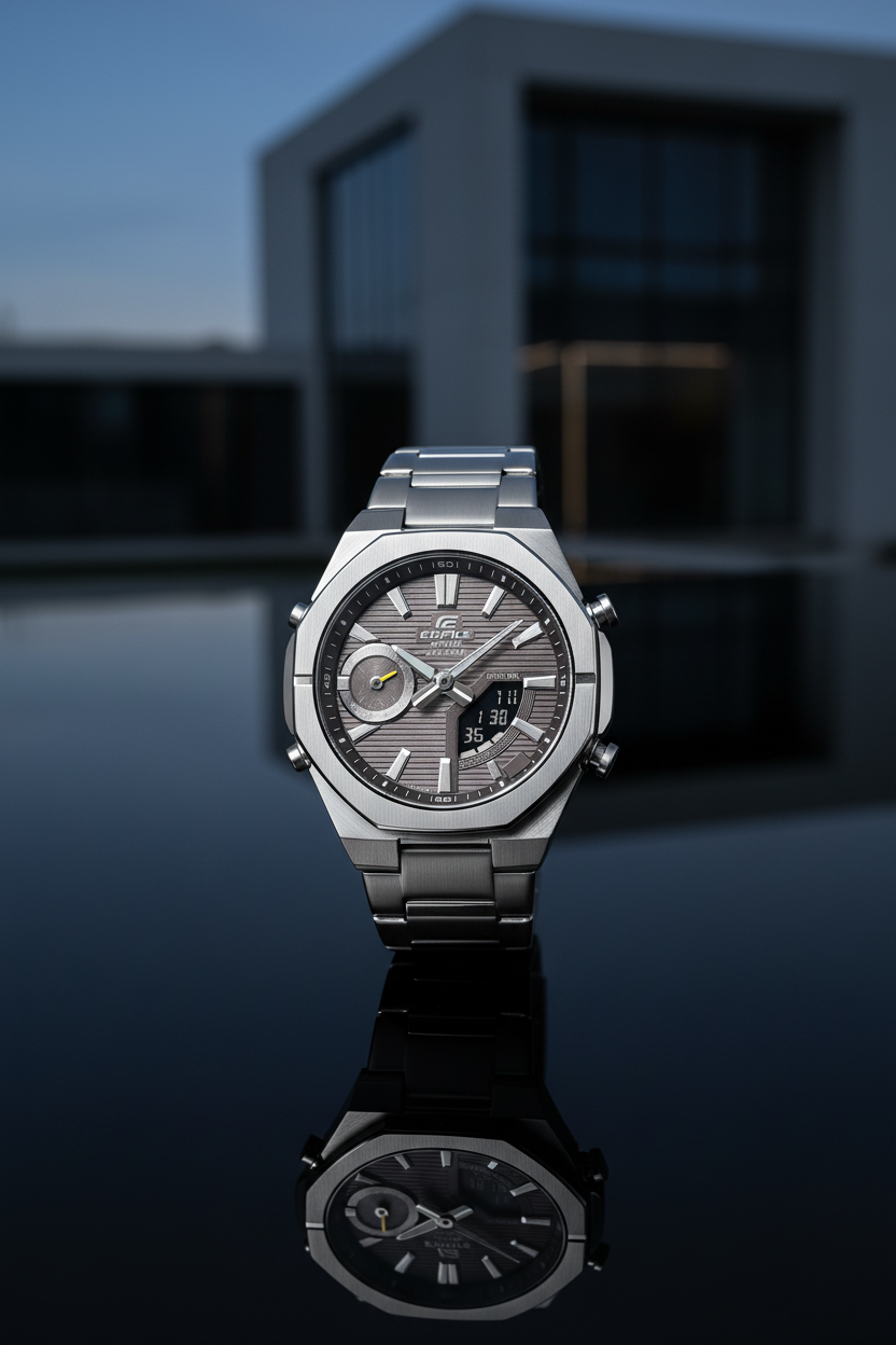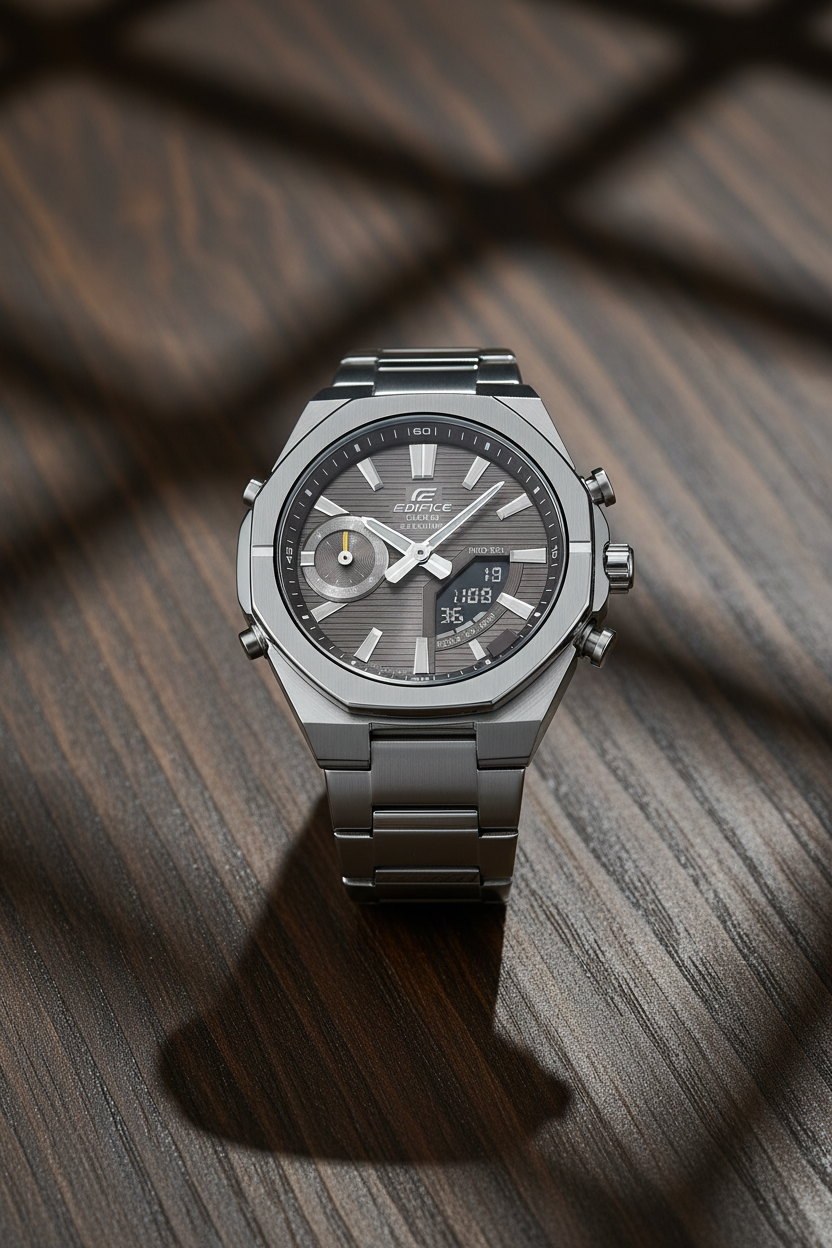 | Funciones especiales | Esfera gris antracita con display analógico-digital, caja y brazalete de acero inoxidable plateado con bisel octogonal deportivo, cristal de zafiro resistente a rayones, doble luz LED (Super Illuminator), función de búsqueda de teléfono, movimiento de agujas para despejar la pantalla, tamaño aproximado 48,1 × 43 × 9,6 mm y peso de 129 g; diseño moderno y delgado ideal para combinar con ropa casual y de oficina. |