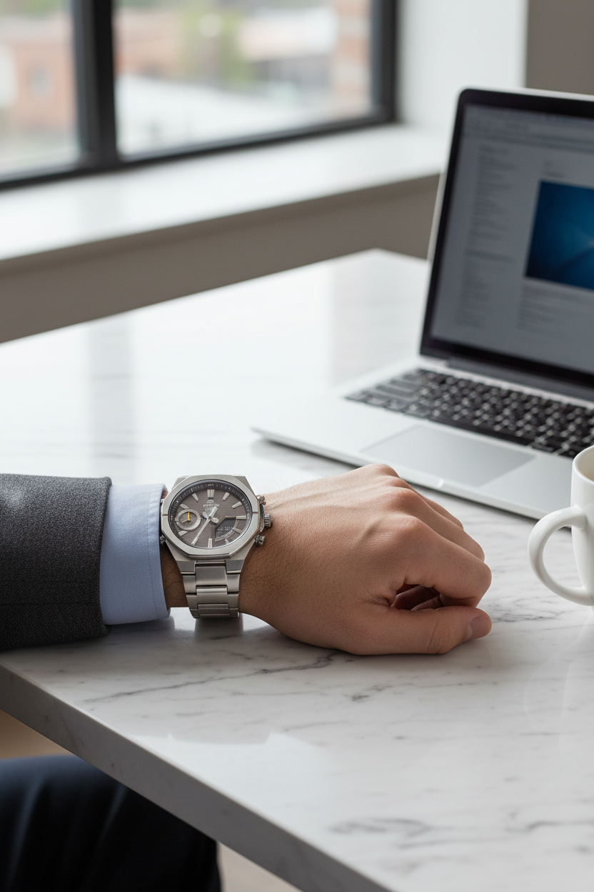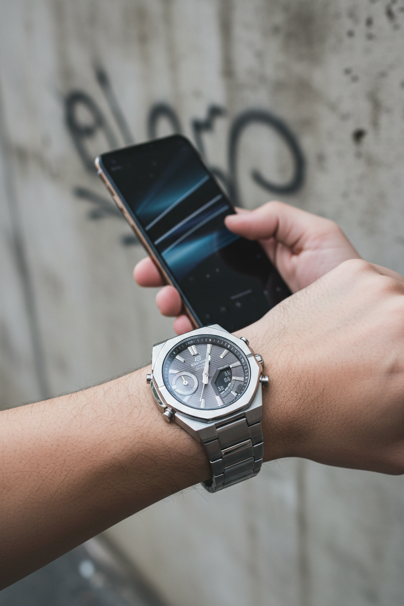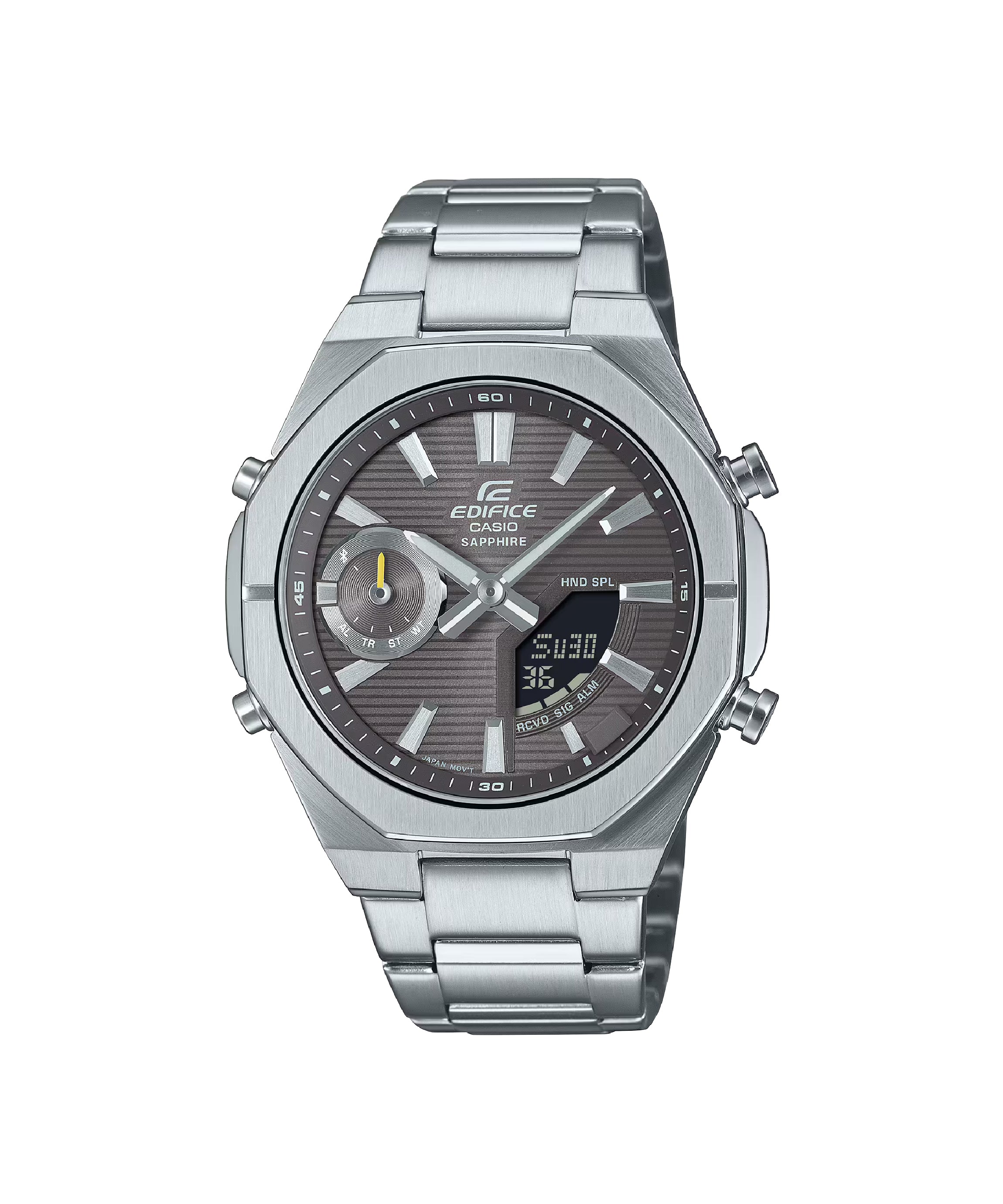 | Funciones especiales | Esfera gris antracita con display analógico-digital, caja y brazalete de acero inoxidable plateado con bisel octogonal deportivo, cristal de zafiro resistente a rayones, doble luz LED (Super Illuminator), función de búsqueda de teléfono, movimiento de agujas para despejar la pantalla, tamaño aproximado 48,1 × 43 × 9,6 mm y peso de 129 g; diseño moderno y delgado ideal para combinar con ropa casual y de oficina. |