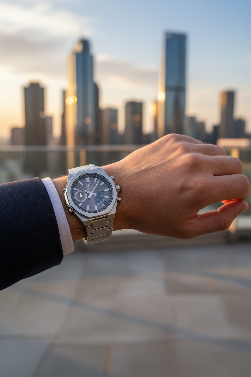 | Funciones principales | Hora analógica y digital combinada con cronógrafo de 1/100 segundos, hora mundial (38 ciudades), temporizador regresivo, 5 alarmas diarias, calendario automático y ajuste de hora automático vía Bluetooth con la app CASIO WATCHES; pensado para uso diario deportivo y de oficina con alta funcionalidad. |