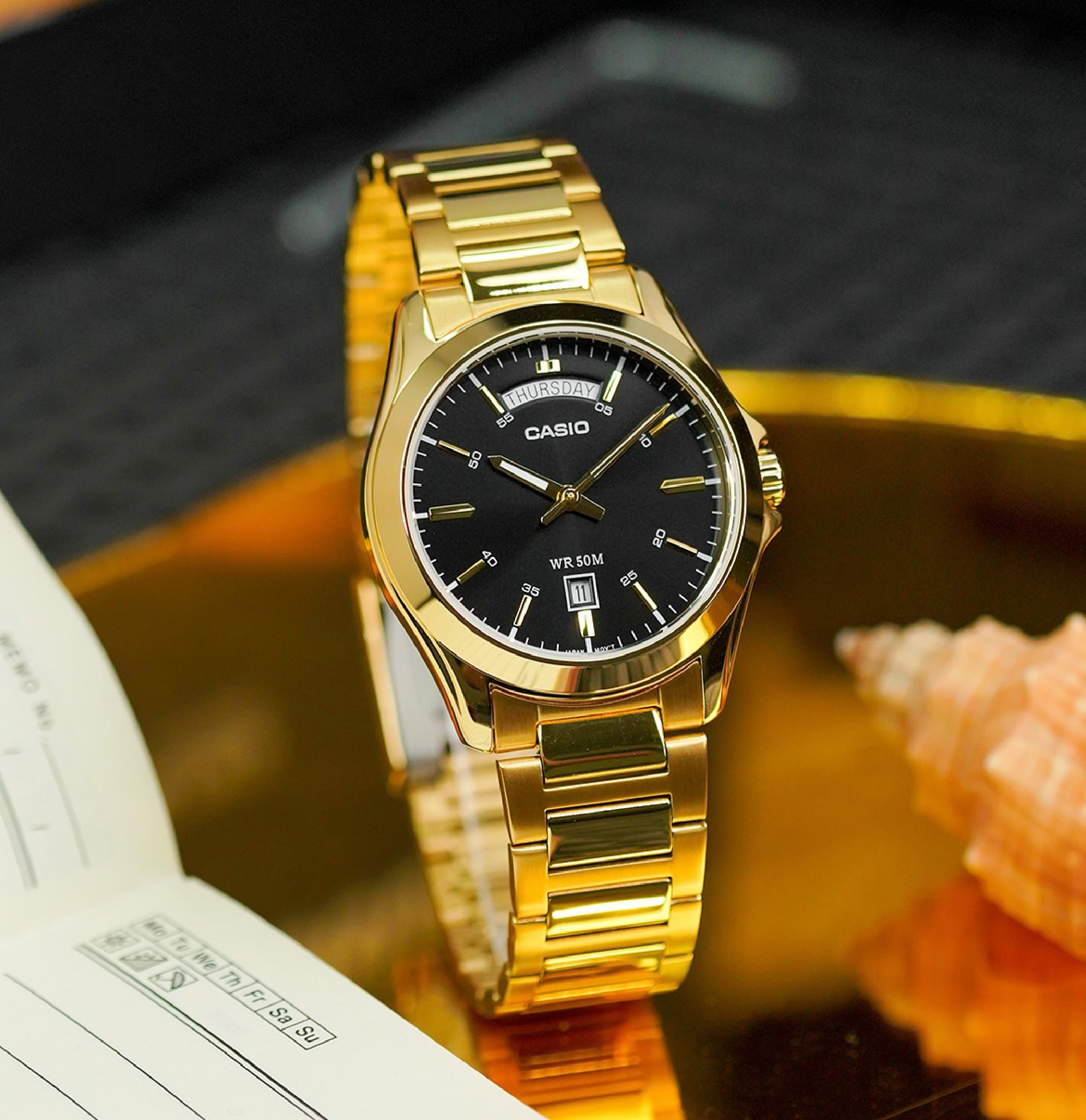 El MTP-1370G-1AVDF combina elegancia y funcionalidad con su diseño dorado y carátula negra. Ideal para ocasiones formales, ofrece precisión, estilo y resistencia al agua, destacando como un reloj clásico y sofisticado.