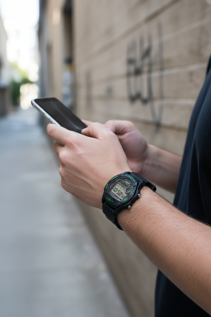 Funciones especiales Caja y correa de resina de base biológica en negro, cristal de resina esférico, luz LED ámbar automática (Auto Light: se activa al inclinar la muñeca en lugares oscuros) con botón de luz frontal dedicado y persistencia; dimensiones 43 × 36,6 × 10,9 mm y peso de 27 g; diseño deportivo compacto y ultraligero, cómodo incluso en muñecas delgadas.
